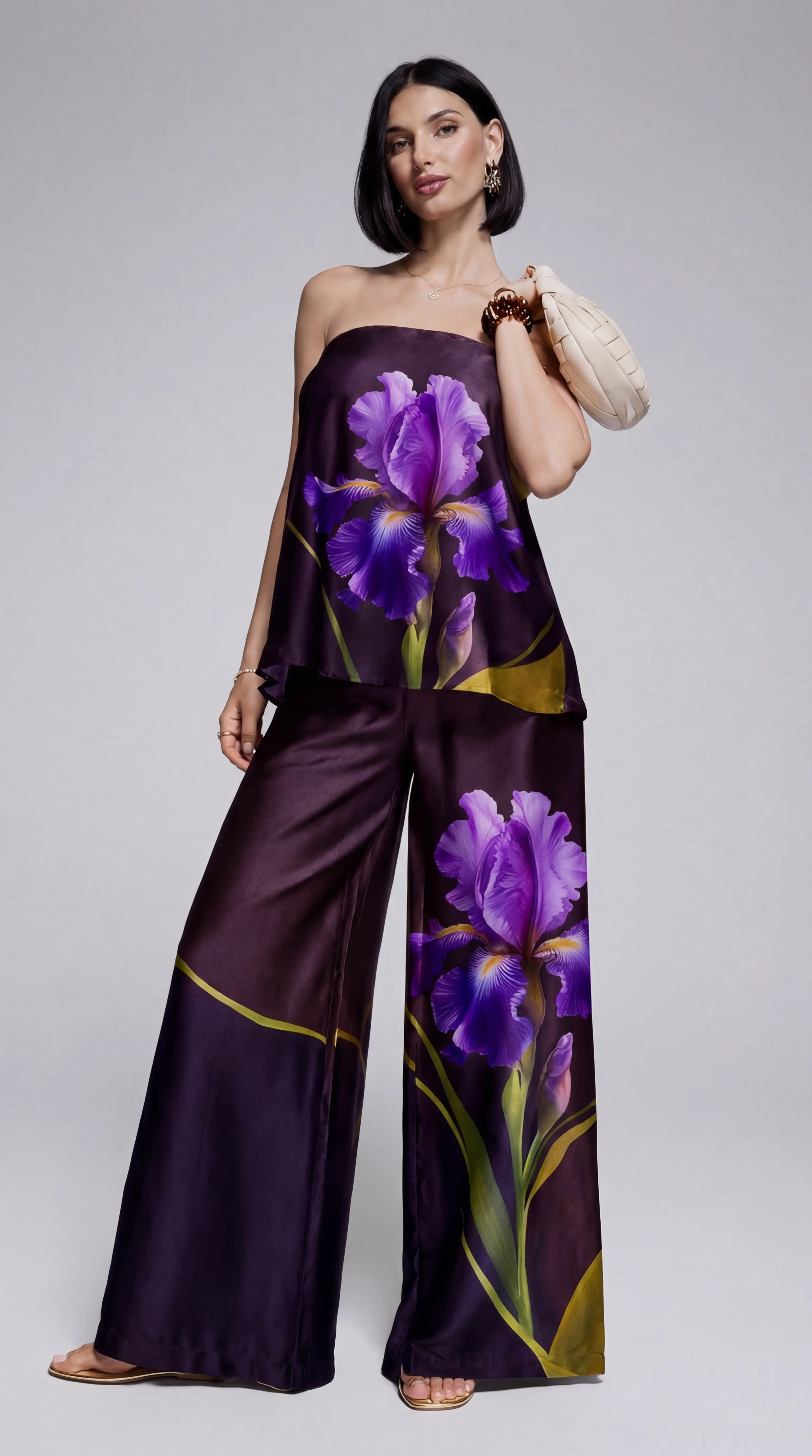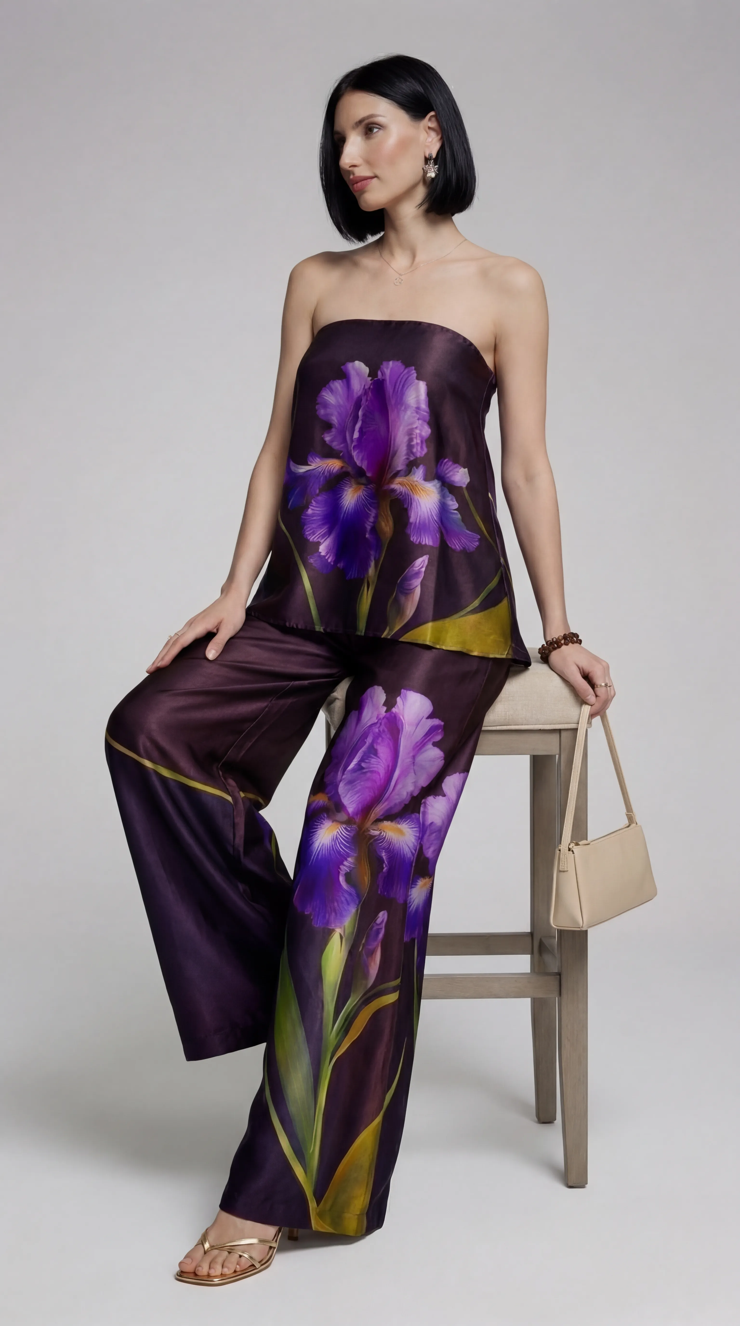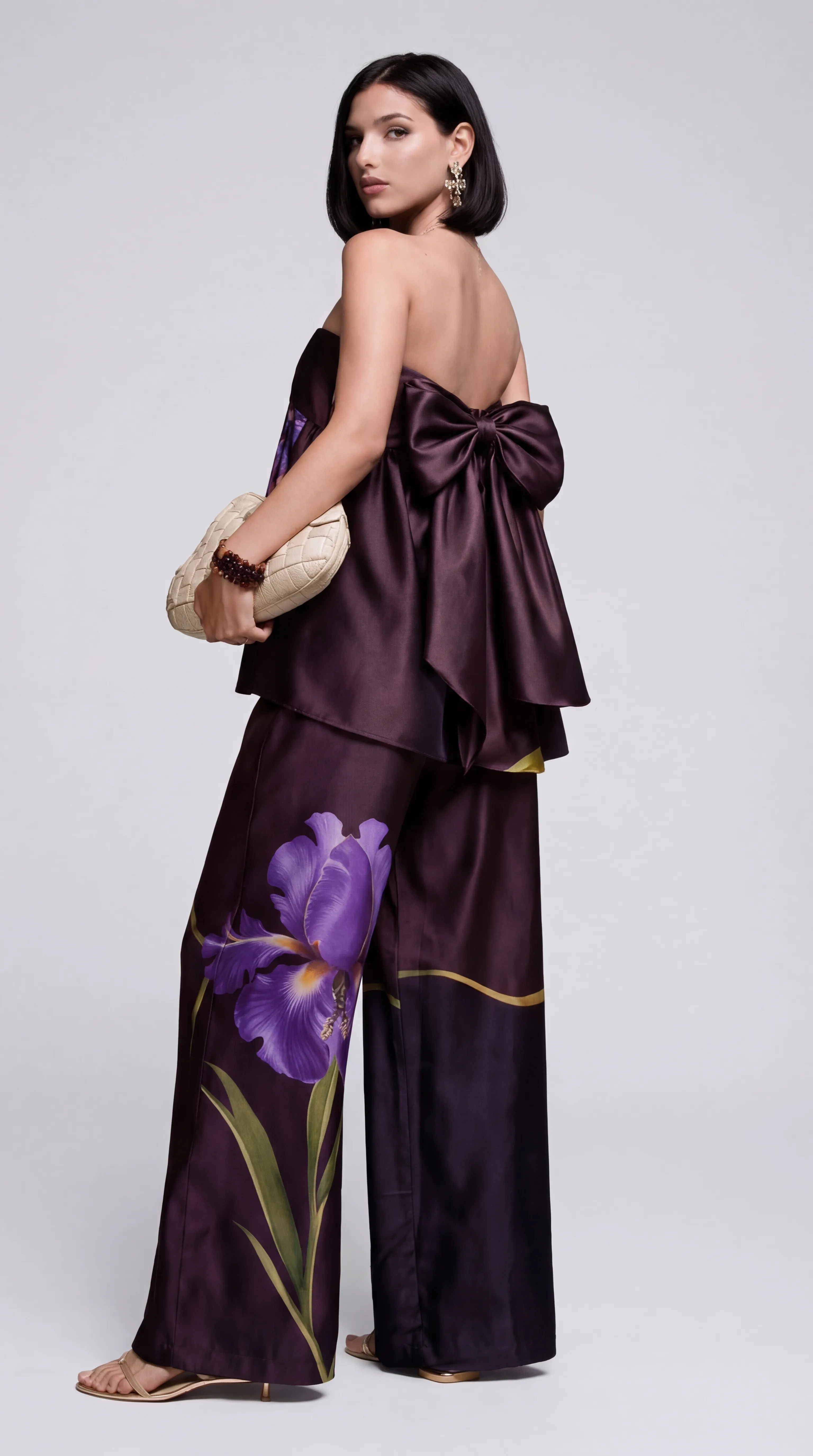 Make a breathtaking statement in the MUS565, a luxury silk set featuring a vibrant, oversized iris print. With its comfortable elasticated tube top, feminine back ribbon, and flowing A-line trousers, this ensemble offers a perfect harmony of high-fashion impact and effortless comfort for your most prestigious events.
