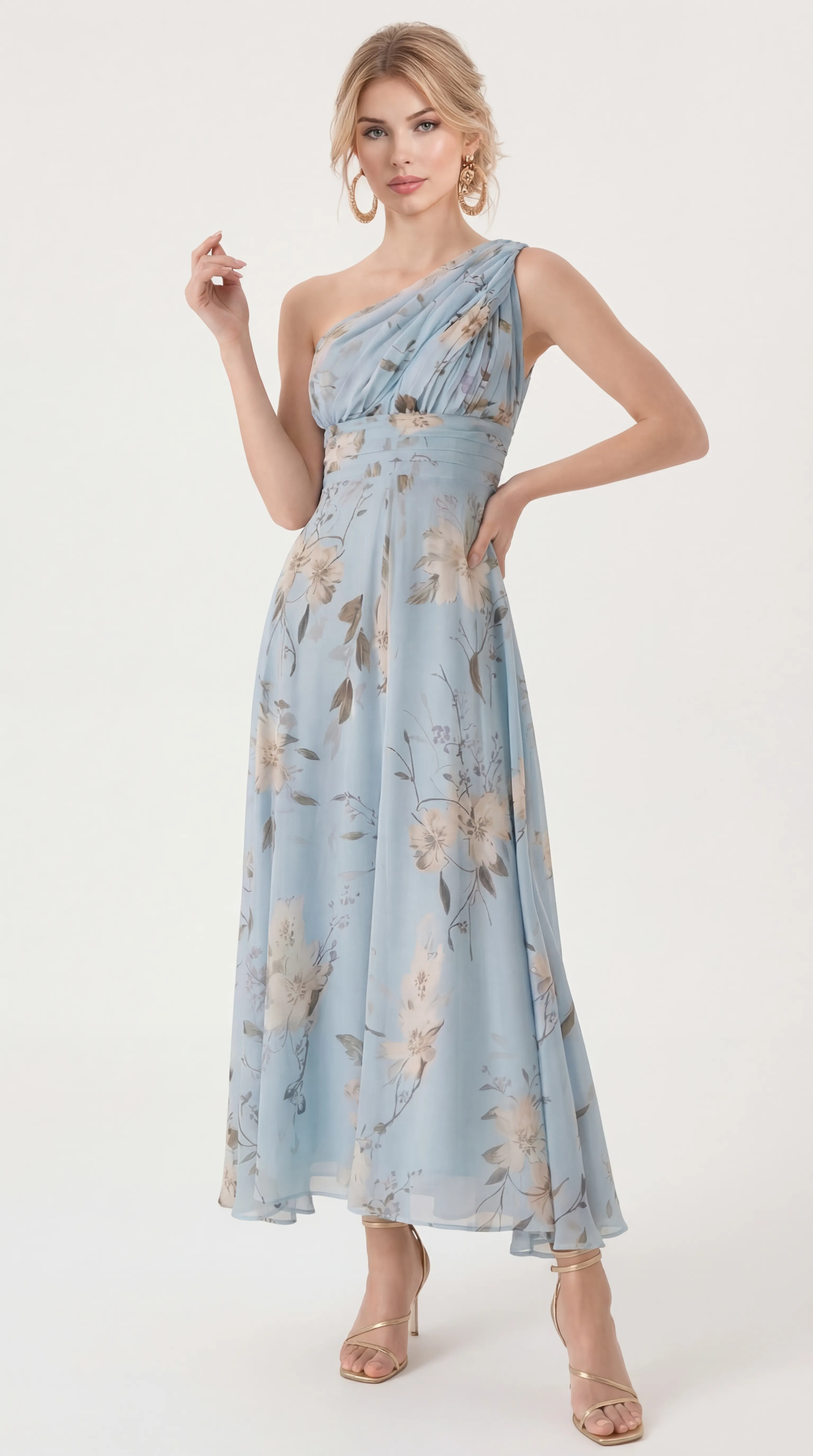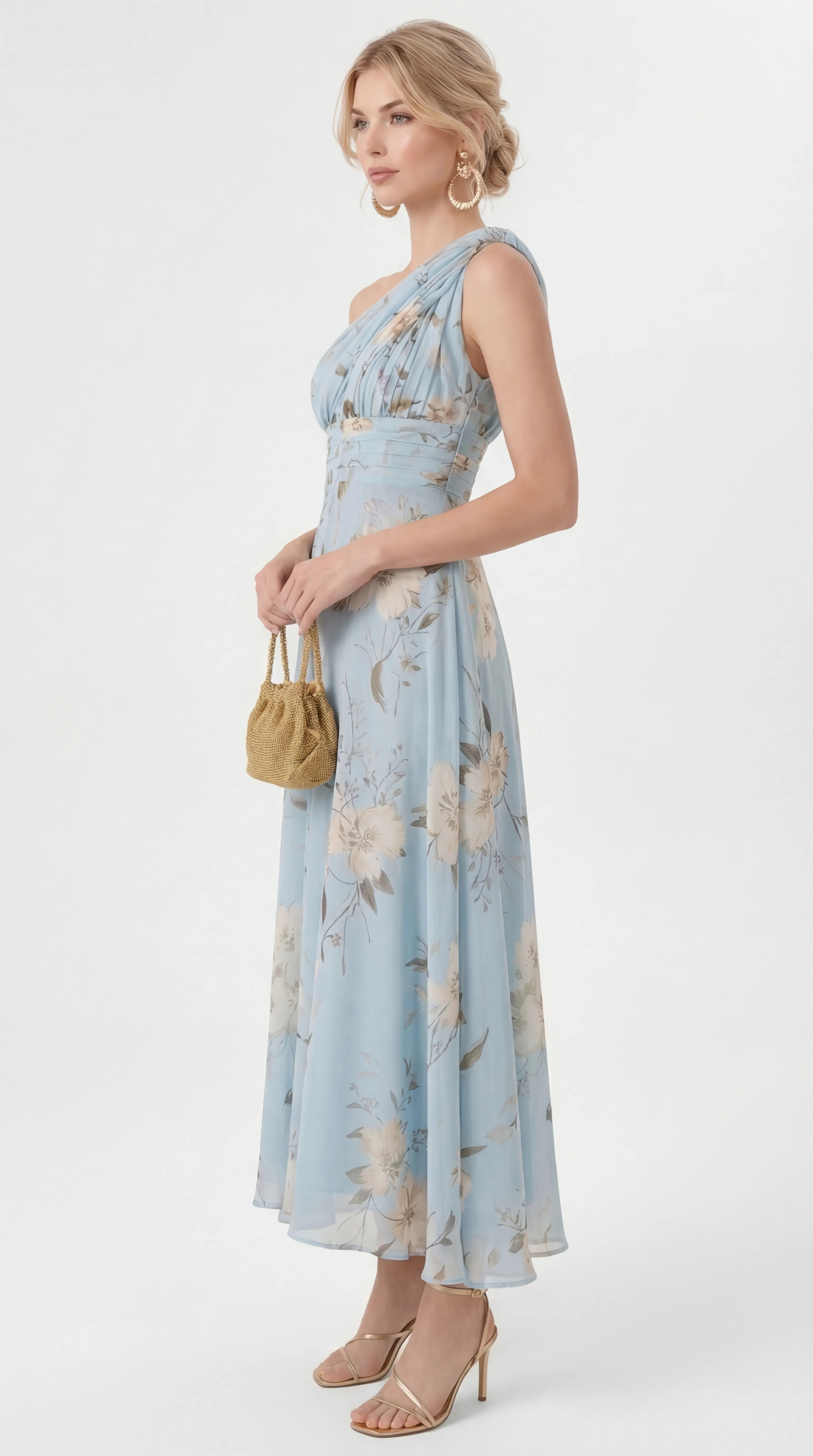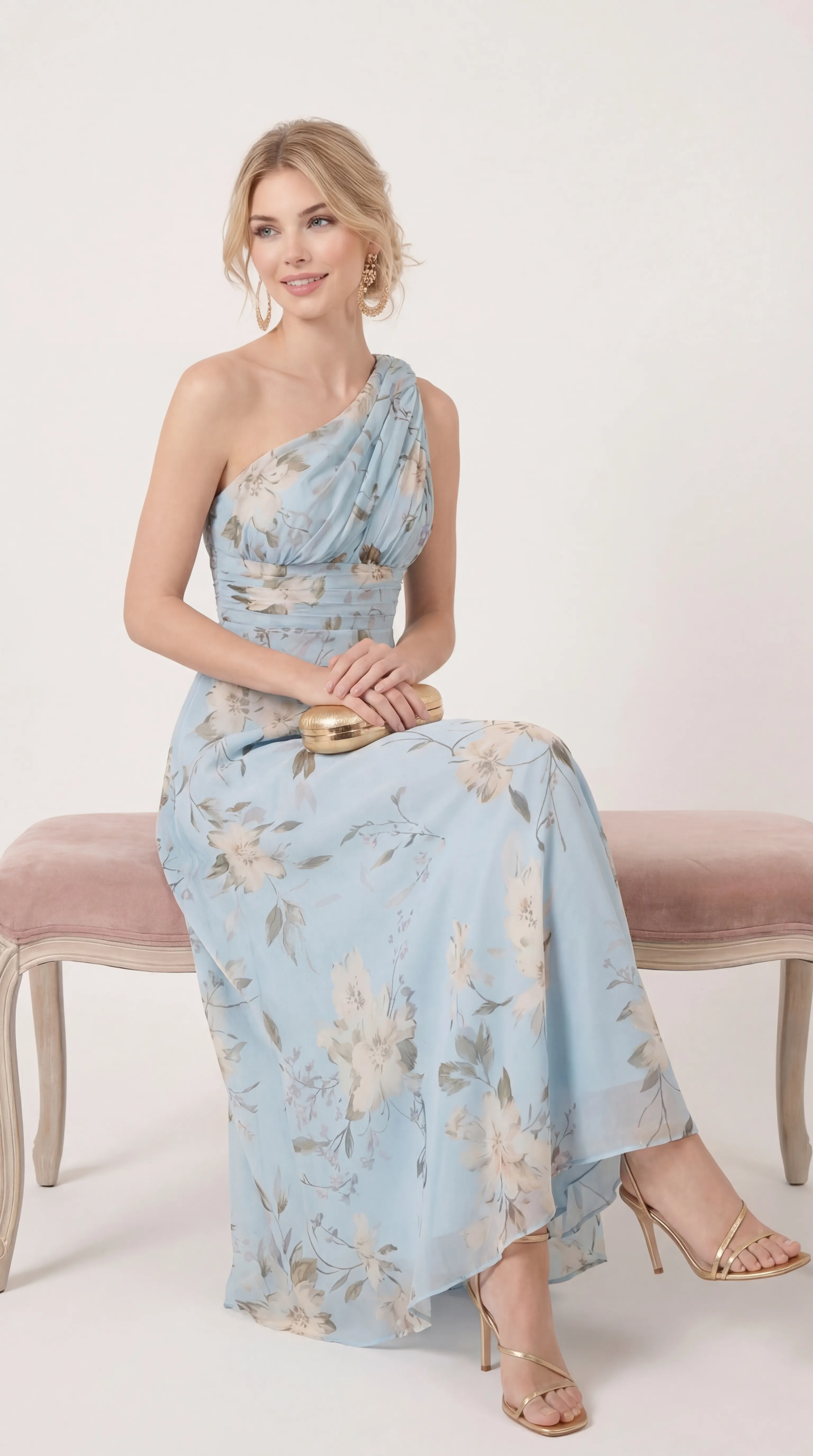 Radiate ethereal beauty in the MUS558, a luxury one-shoulder gown that blends modern structural details with soft, sky-blue botanical art. With its artisanal rolled shoulder, heavy bodice ruching, and a perfectly pleated waist, this silk tơ gown is engineered to provide a sophisticated and breathtaking silhouette for your most memorable celebrations.