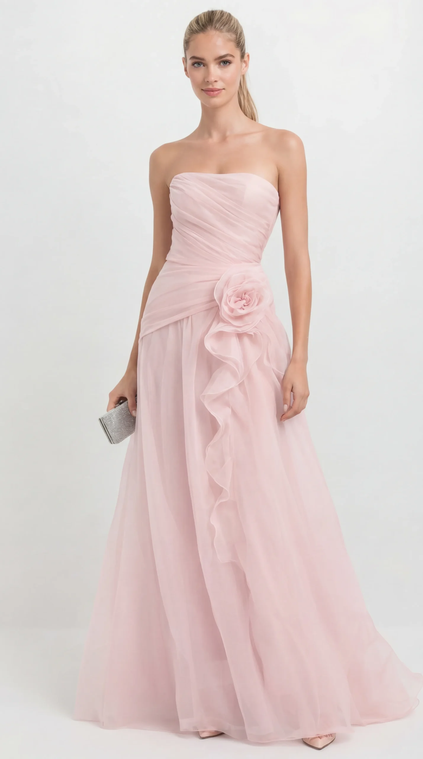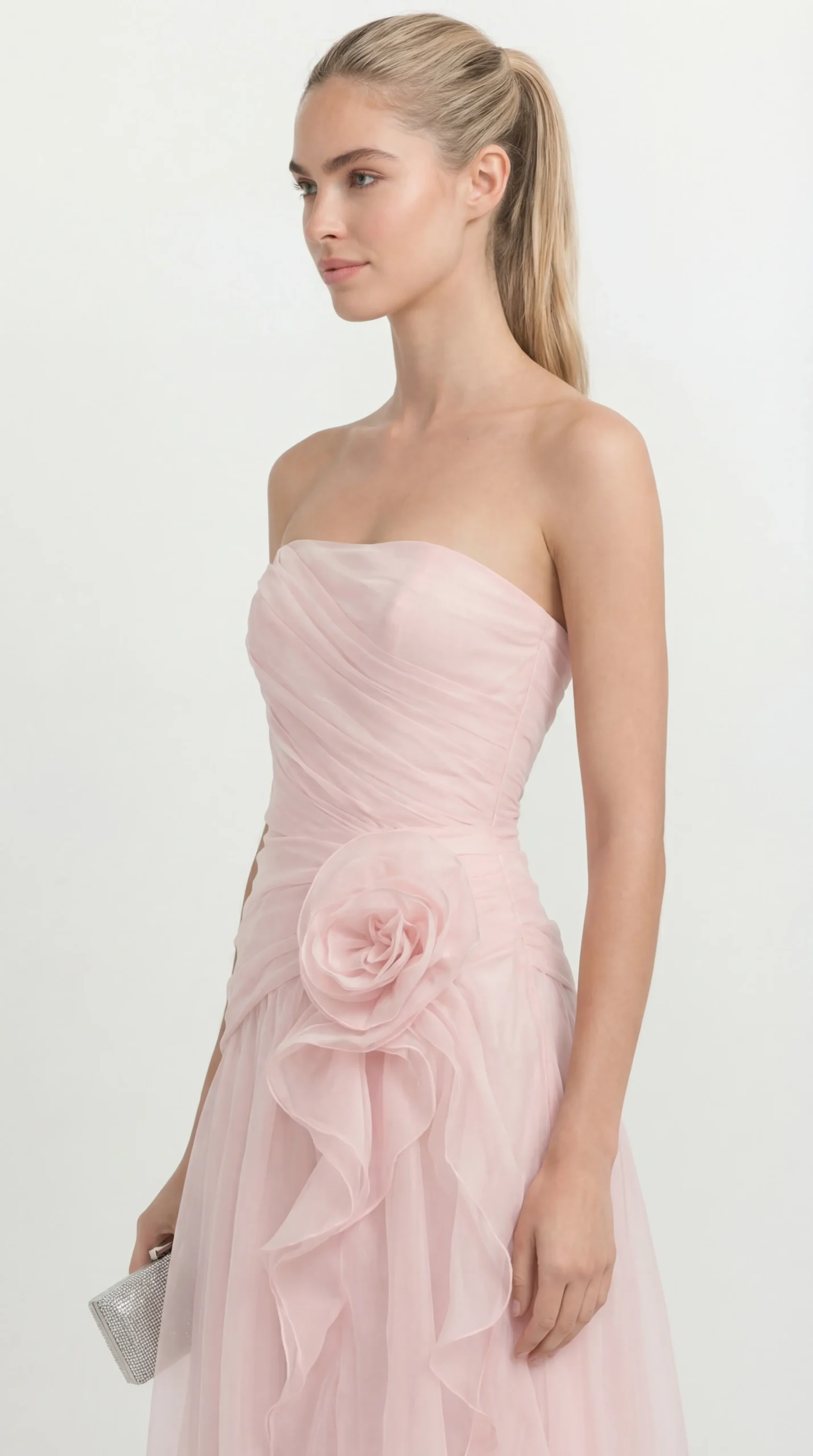 • Cohesive Rear Aesthetic: The back of the gown mirrors the front's elegance, featuring the same pleated texture and a matching 3D rose accent atop the ruffles.