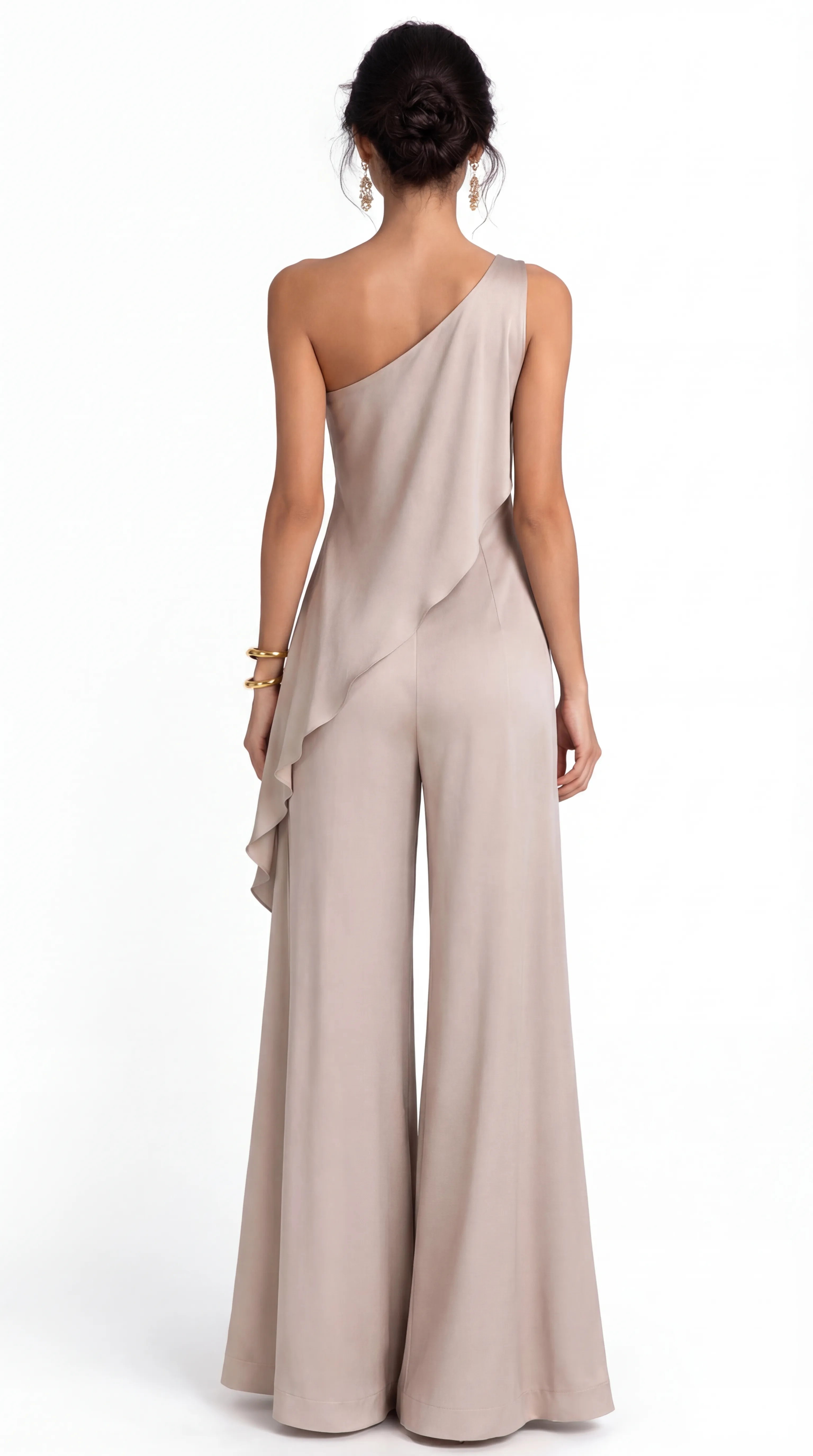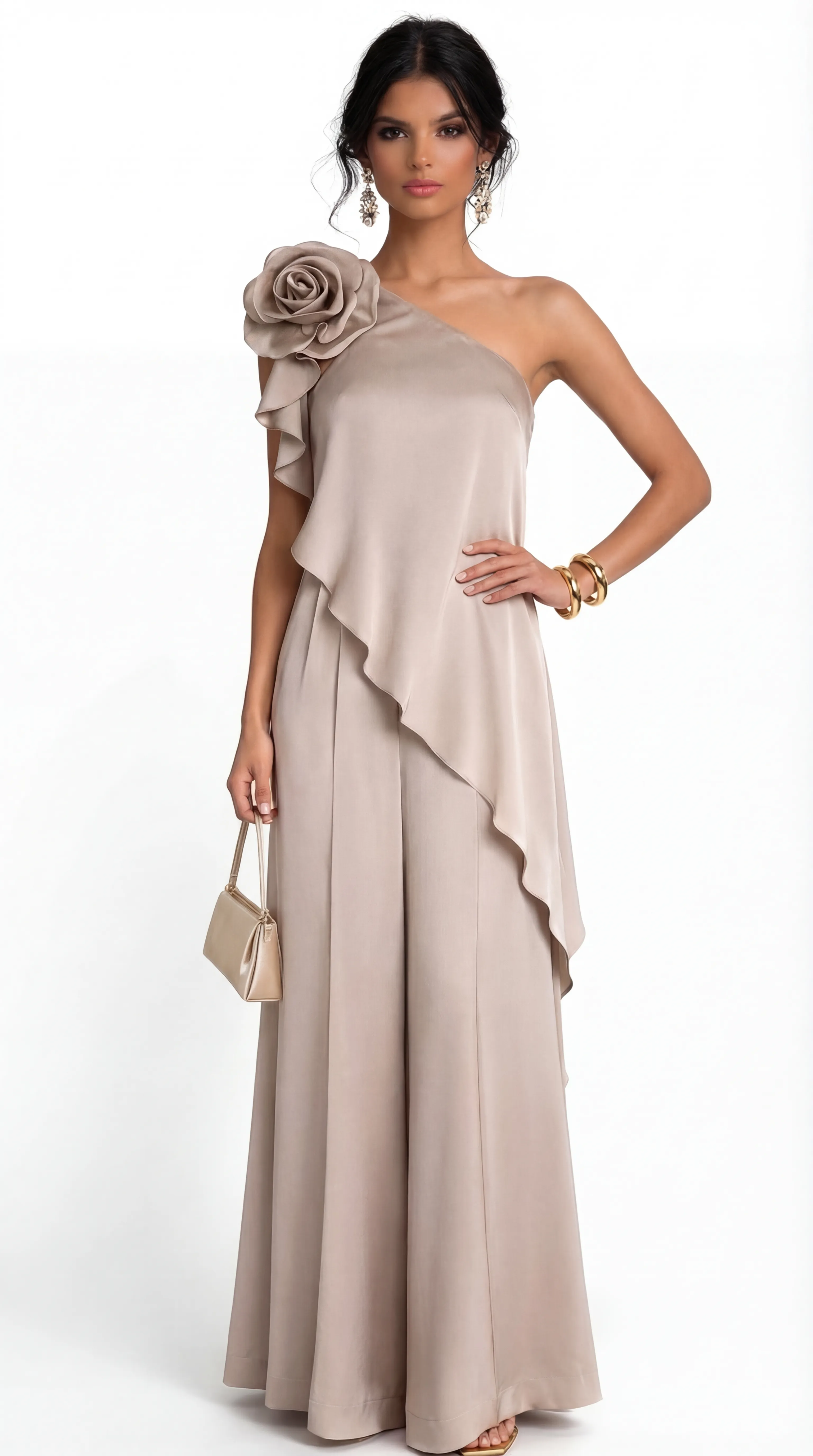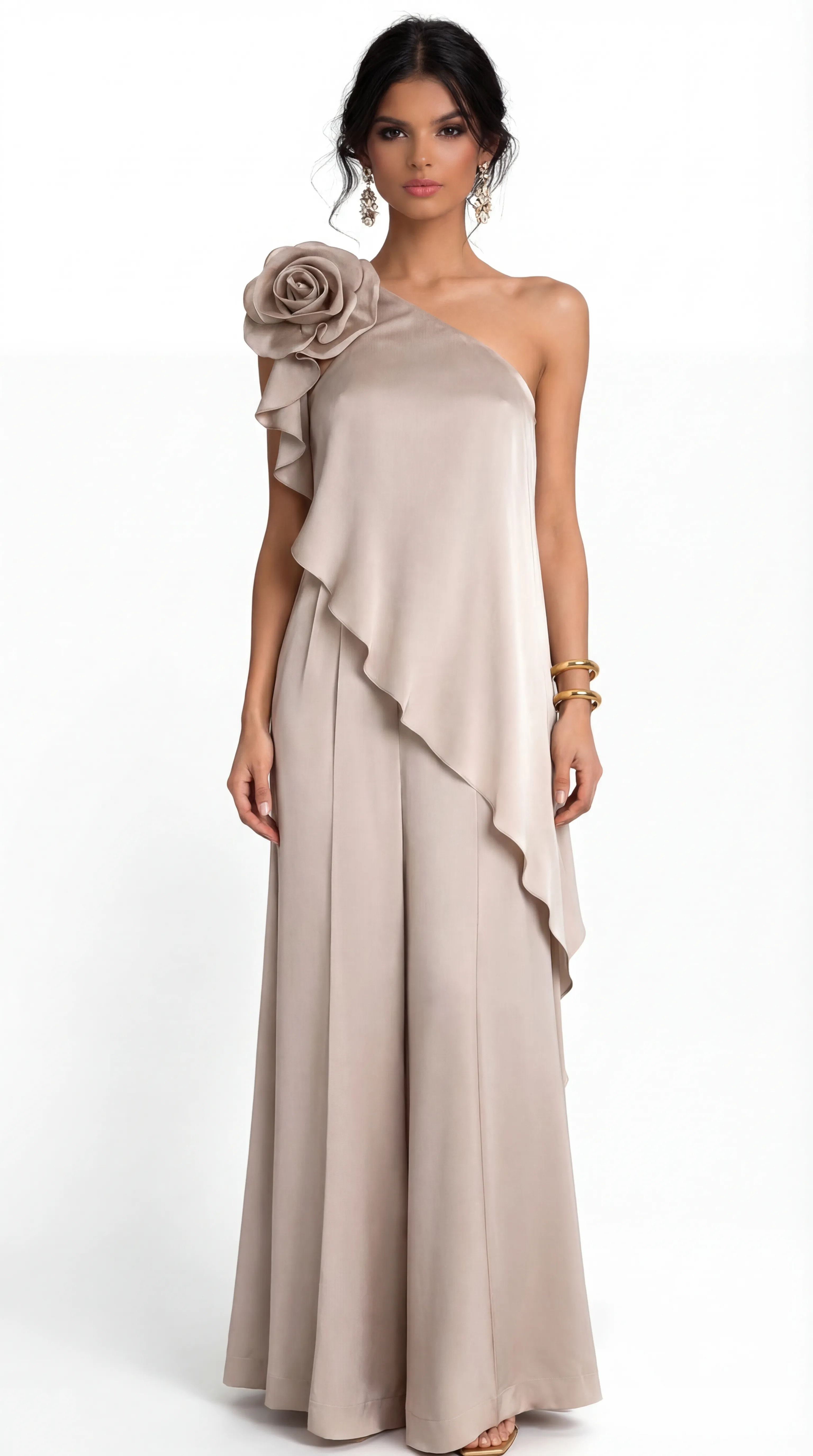 Exude timeless radiance in the MUS559, a luxury silk jumpsuit that marries architectural detail with soft champagne brilliance. Featuring a dramatic hand-rolled rose and a fluid, wide-leg silhouette, this ensemble offers a sophisticated and statuesque alternative to the traditional evening gown.