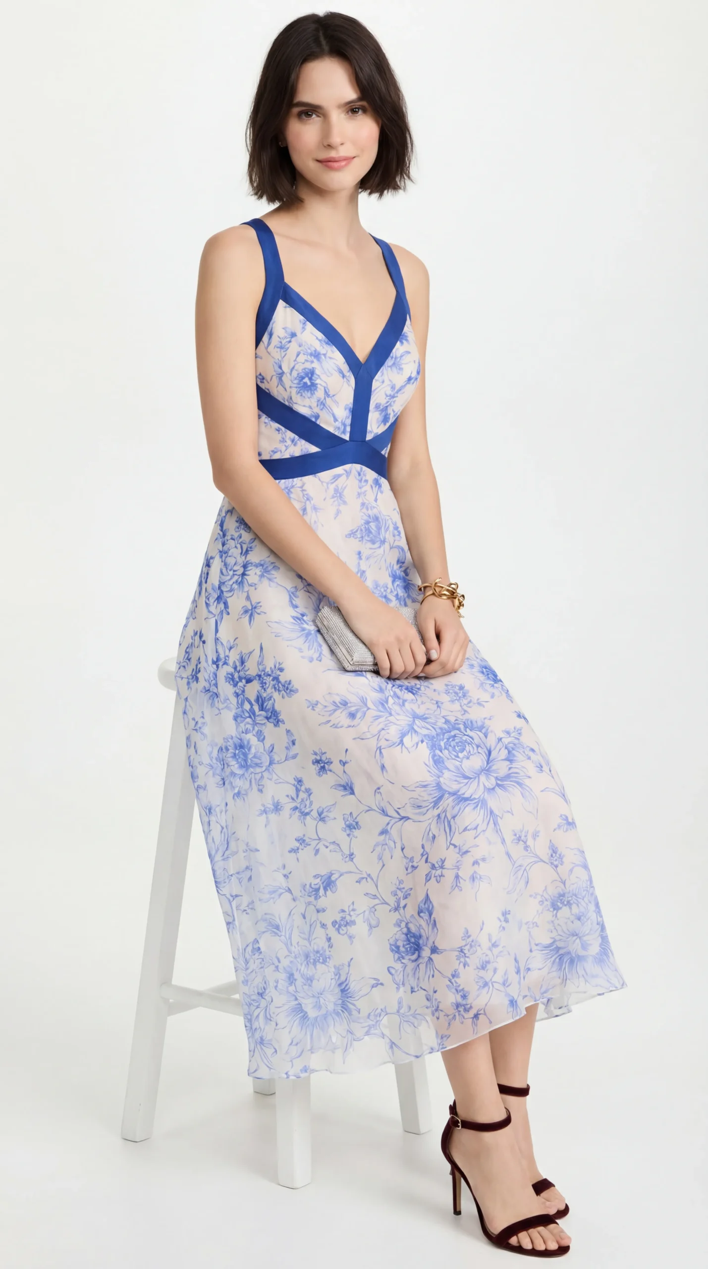 "X" Motif Waistband: The solid blue silk bands intersect at the waist in an architectural "X" pattern, creating an immediate slimming effect and an hourglass shape.