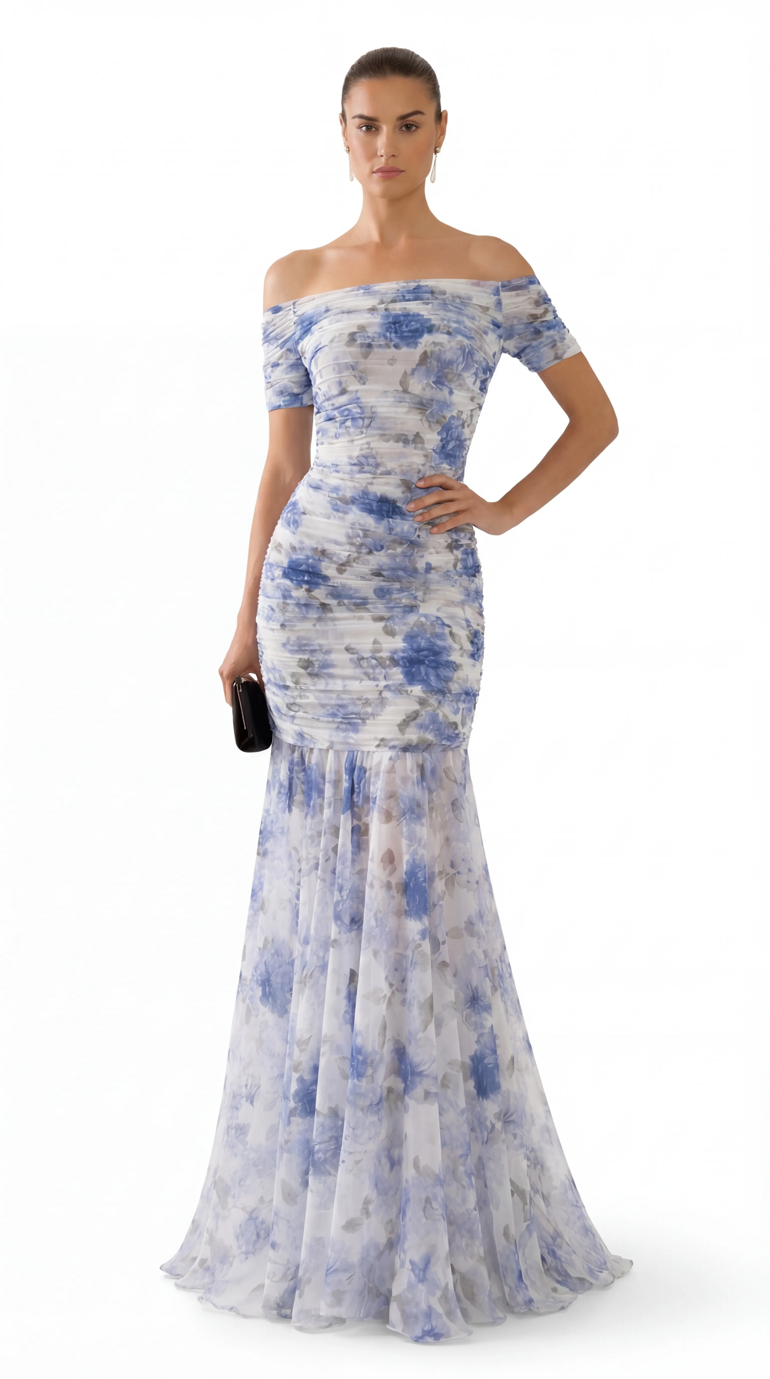 • Off-the-Shoulder Ruched Bodice: Features a sophisticated straight-across neckline with short sleeves, defined by tight horizontal ruching that creates a textured, sculpted silhouette.