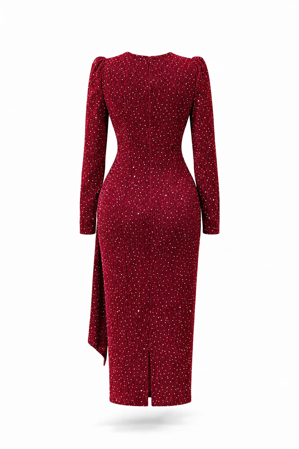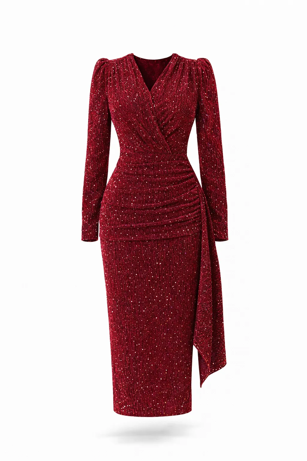 A shimmering burgundy bodycon midi dress crafted from premium glitter-knit fabric, featuring a flattering V-neckline, waist drape detail, double-layer construction, and a subtle back slit.