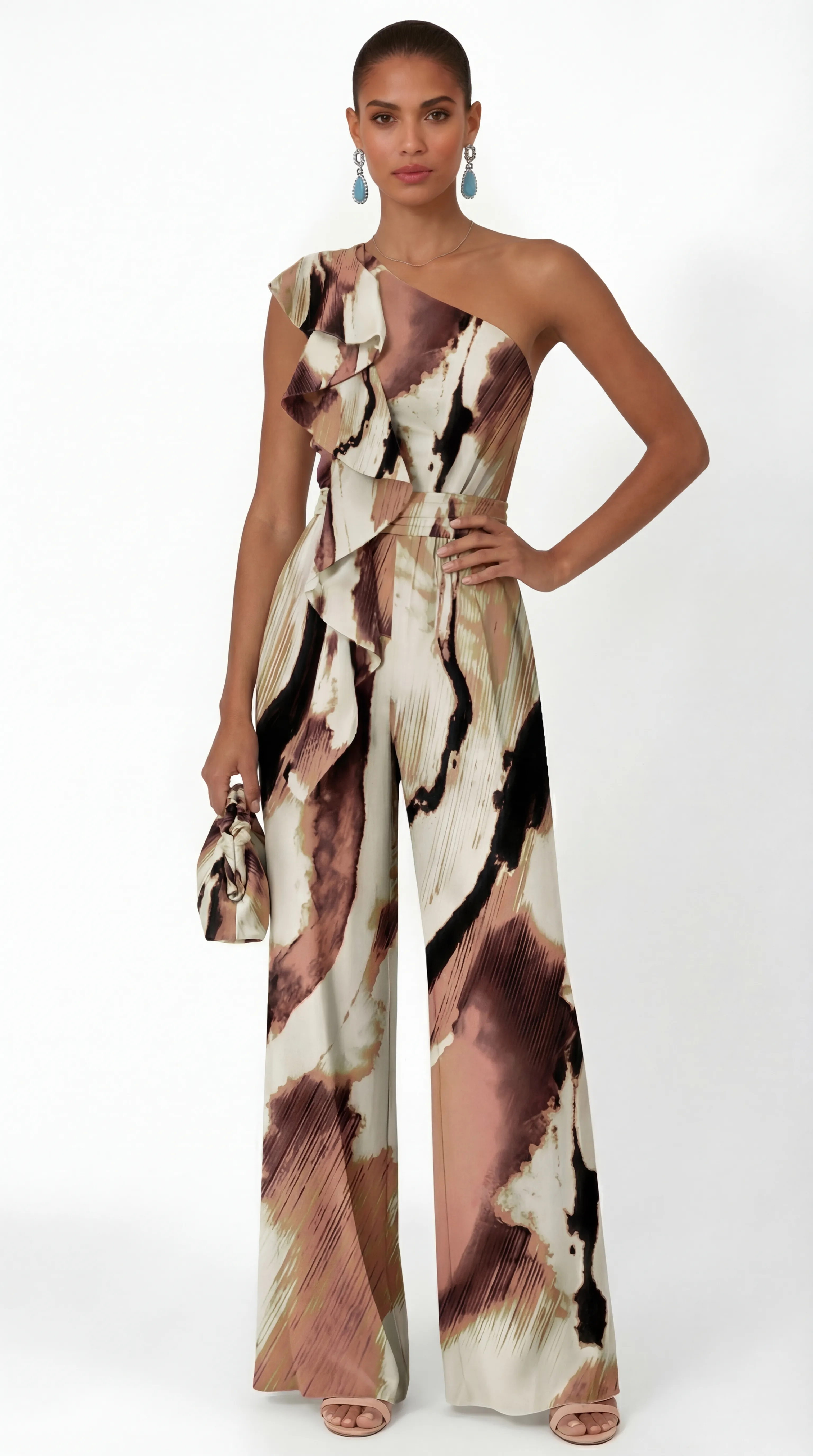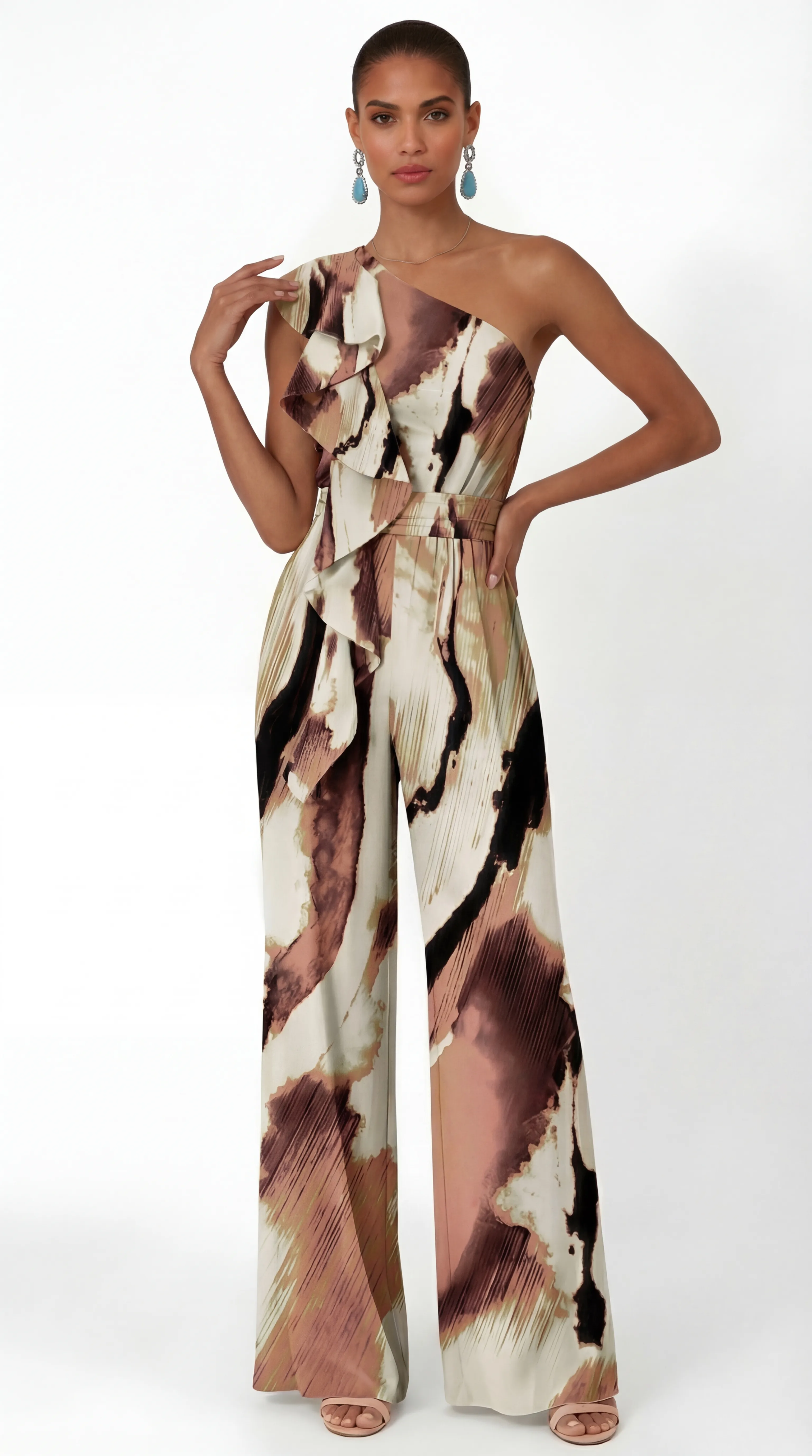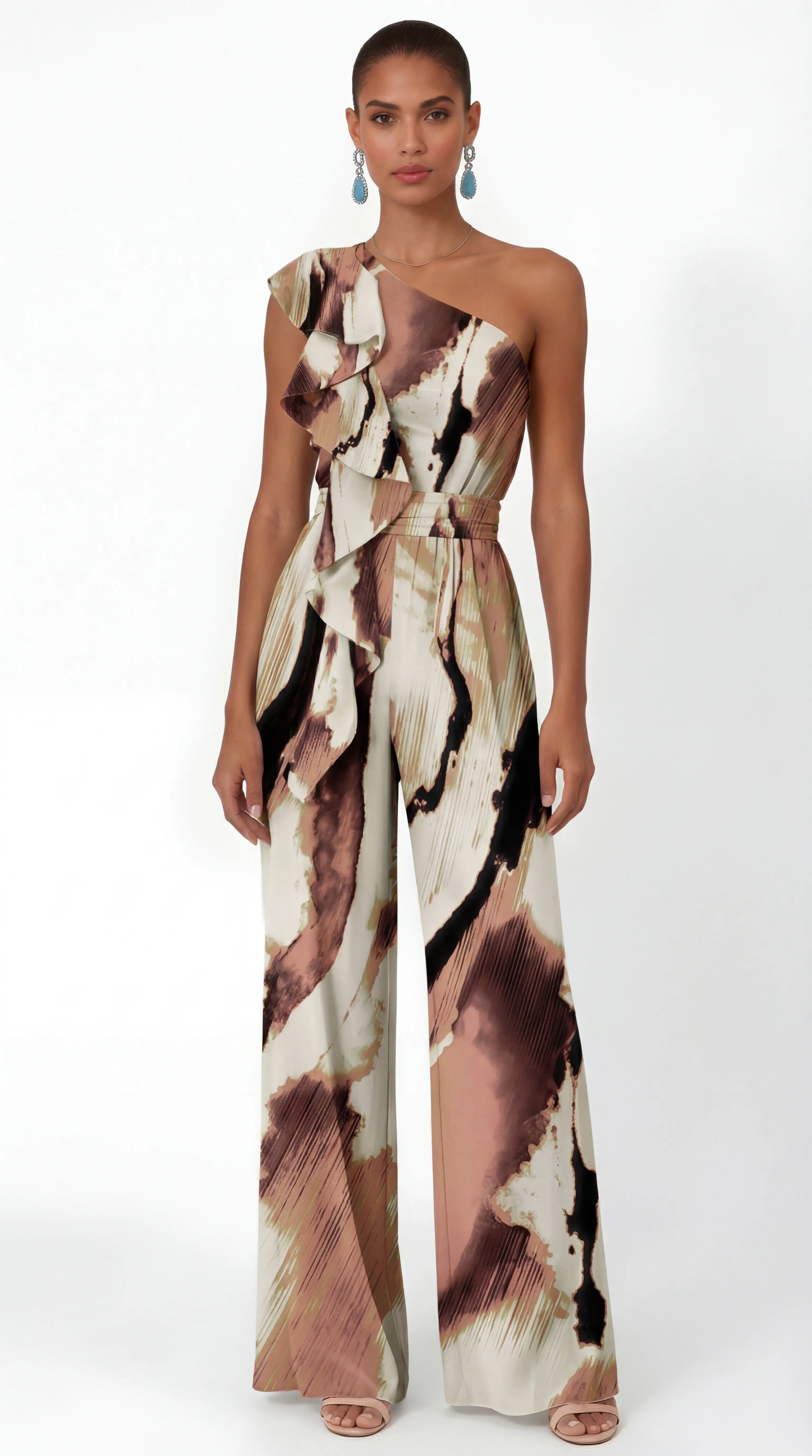 • Synchronized Back Aesthetic: The rear of the jumpsuit is engineered to perfectly mirror the abstract watercolor print and refined silk texture shown in the primary imagery.