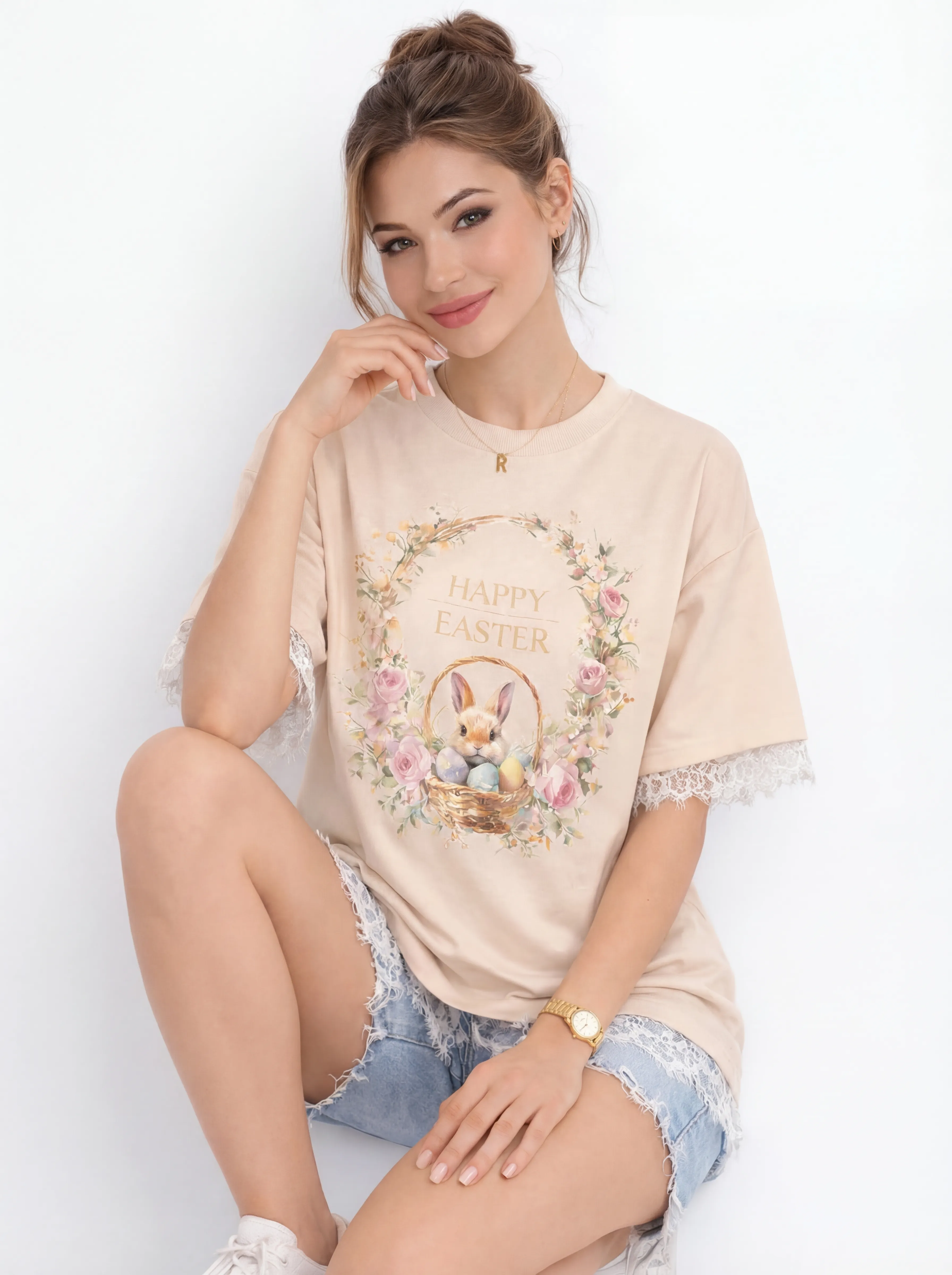 The MUS423 is a masterpiece of spring fashion, pairing heavy 250g cotton with delicate lace-trimmed hems and an innovative split-back lace panel. Featuring a vibrant Easter-themed print, this beige tee offers a sophisticated balance of streetwear comfort and boutique elegance.