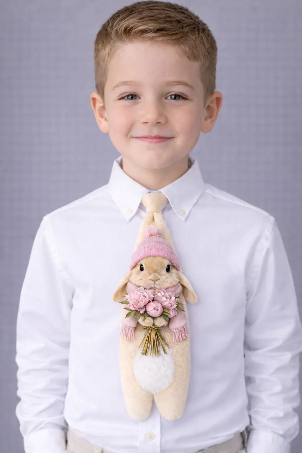 Add a touch of whimsical luxury to his spring wardrobe with the MUS443 tie. Featuring a realistic thermal-printed bunny in a cozy pink scarf and beanie, this heavy silk tie is reinforced with double-sided interlining for a premium, structured look that is perfect for any festive occasion.