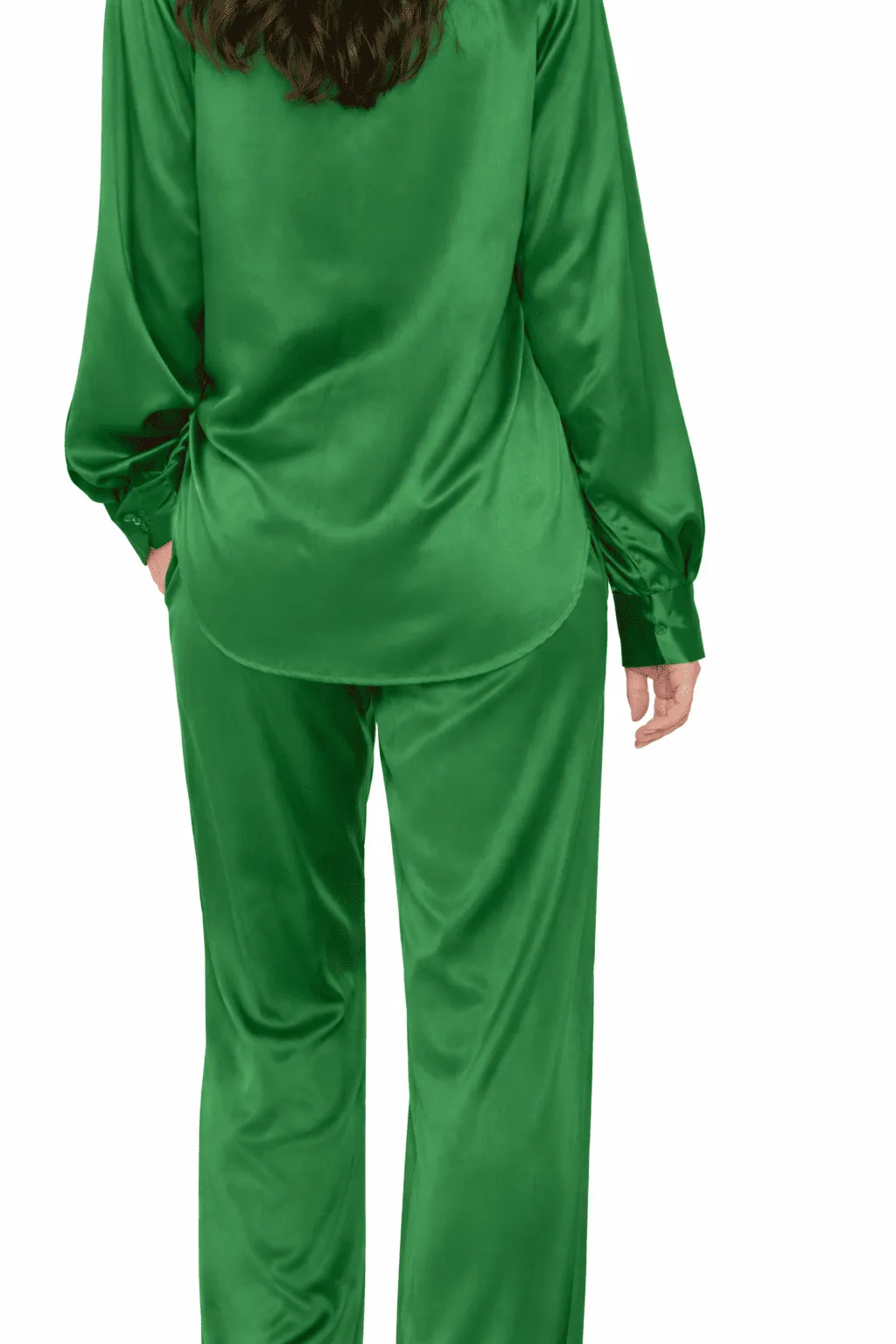 The MDU404US is a luxury two-piece set defined by its vibrant emerald silk and effortless tailored silhouette. Combining a classic long-sleeve shirt with structured wide-leg trousers, it offers a refined and modern approach to holiday glamour.