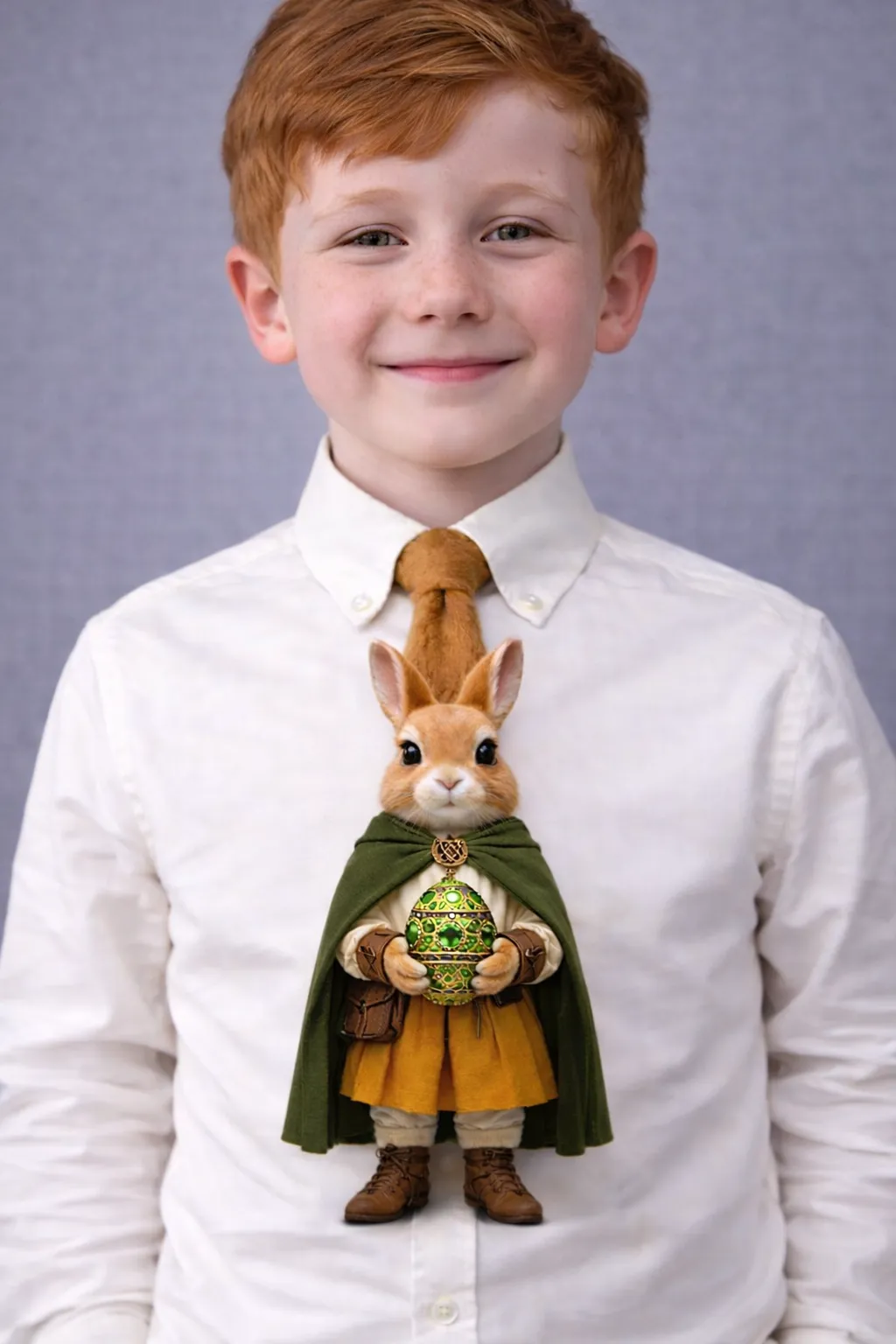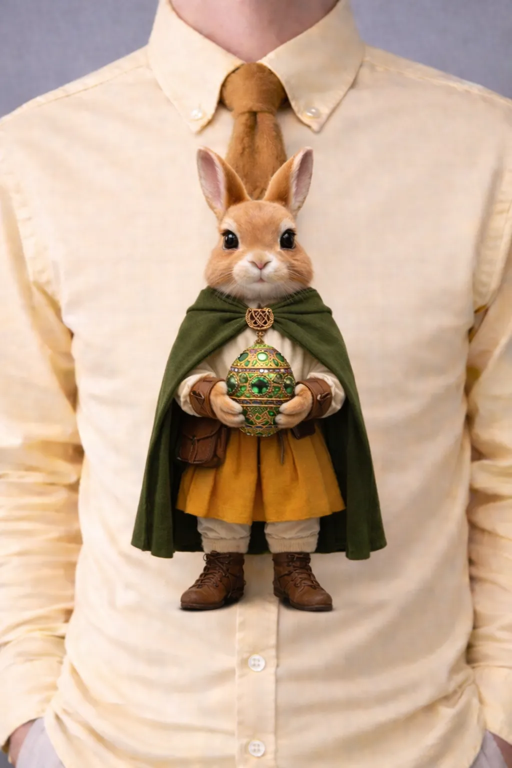 Intricate Accessories: The character holds a large, ornate Easter egg encrusted with green gemstones and gold filigree, adding a touch of mystical elegance to the design.