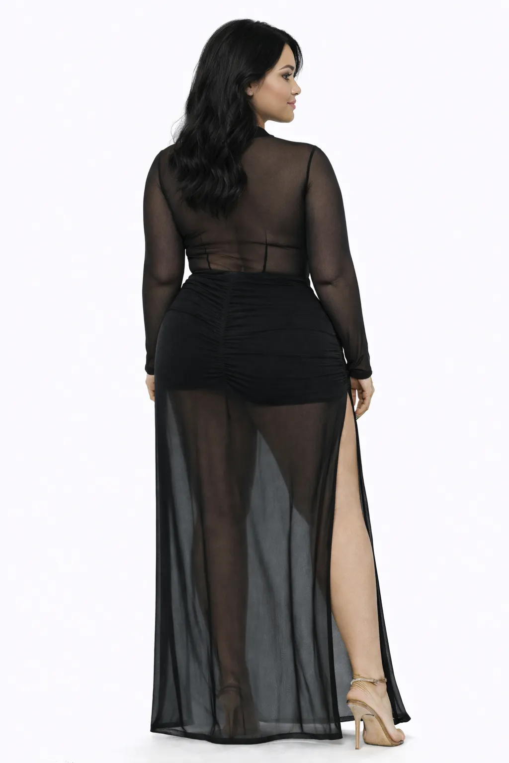 Silhouette: A floor-length maxi cut that combines the sheer mesh's flow with a structured inner lining for a sophisticated "illusion" effect.