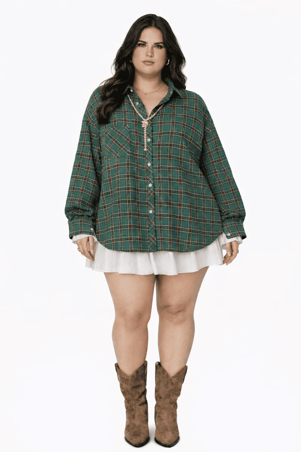 Pattern & Color: Features a sophisticated green and rust-brown tartan plaid, offering a warm and grounded take on seasonal festive attire.