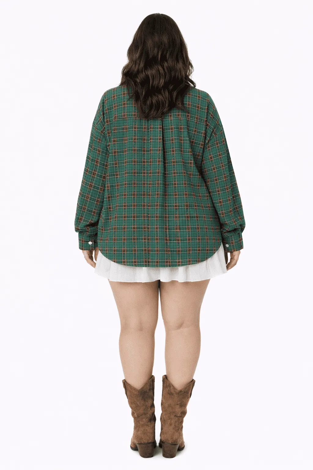 Back View: The high-quality cotton plaid and integrated silk gauze hem continue across the back, ensuring a consistent and polished aesthetic from every angle.