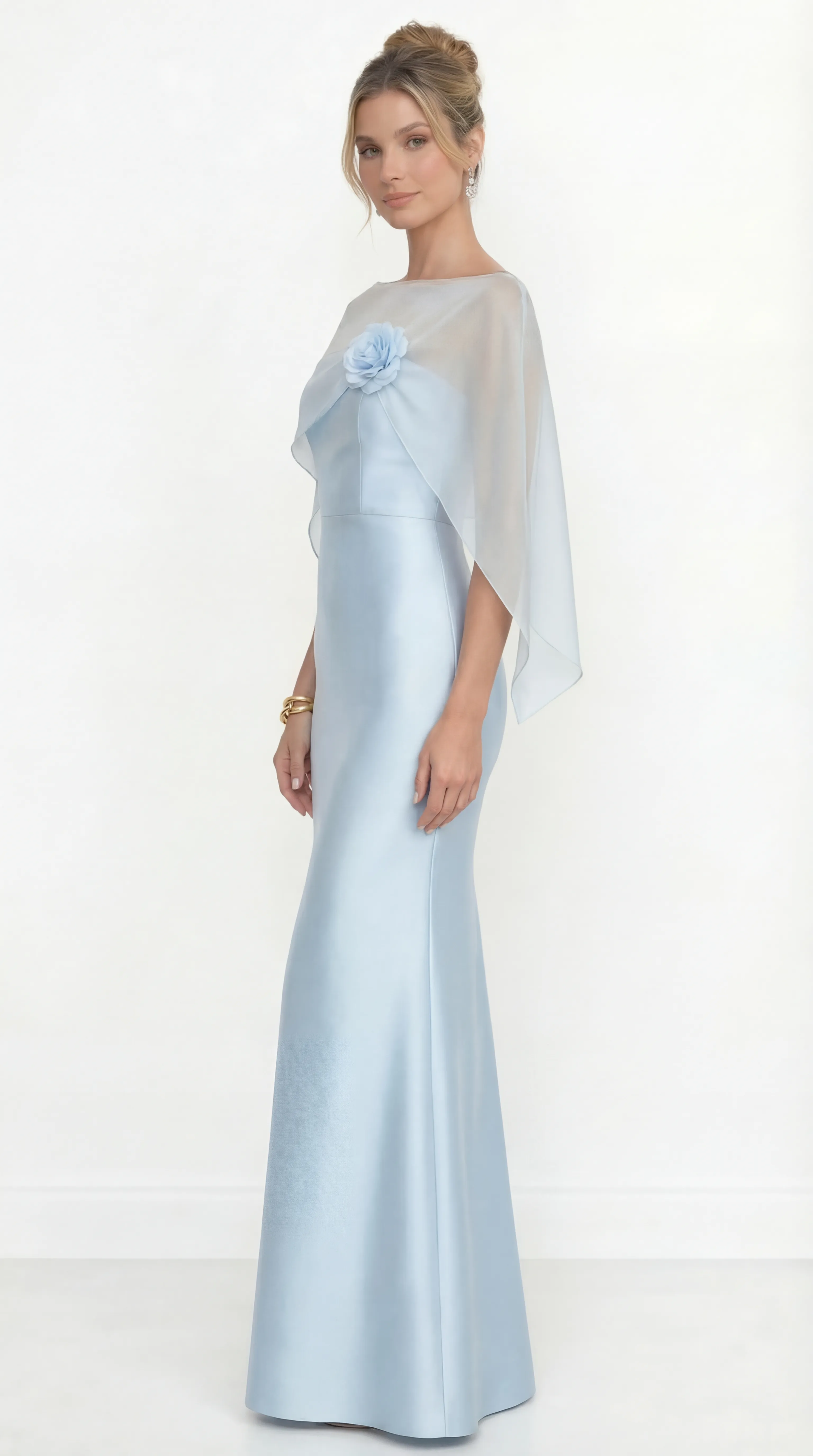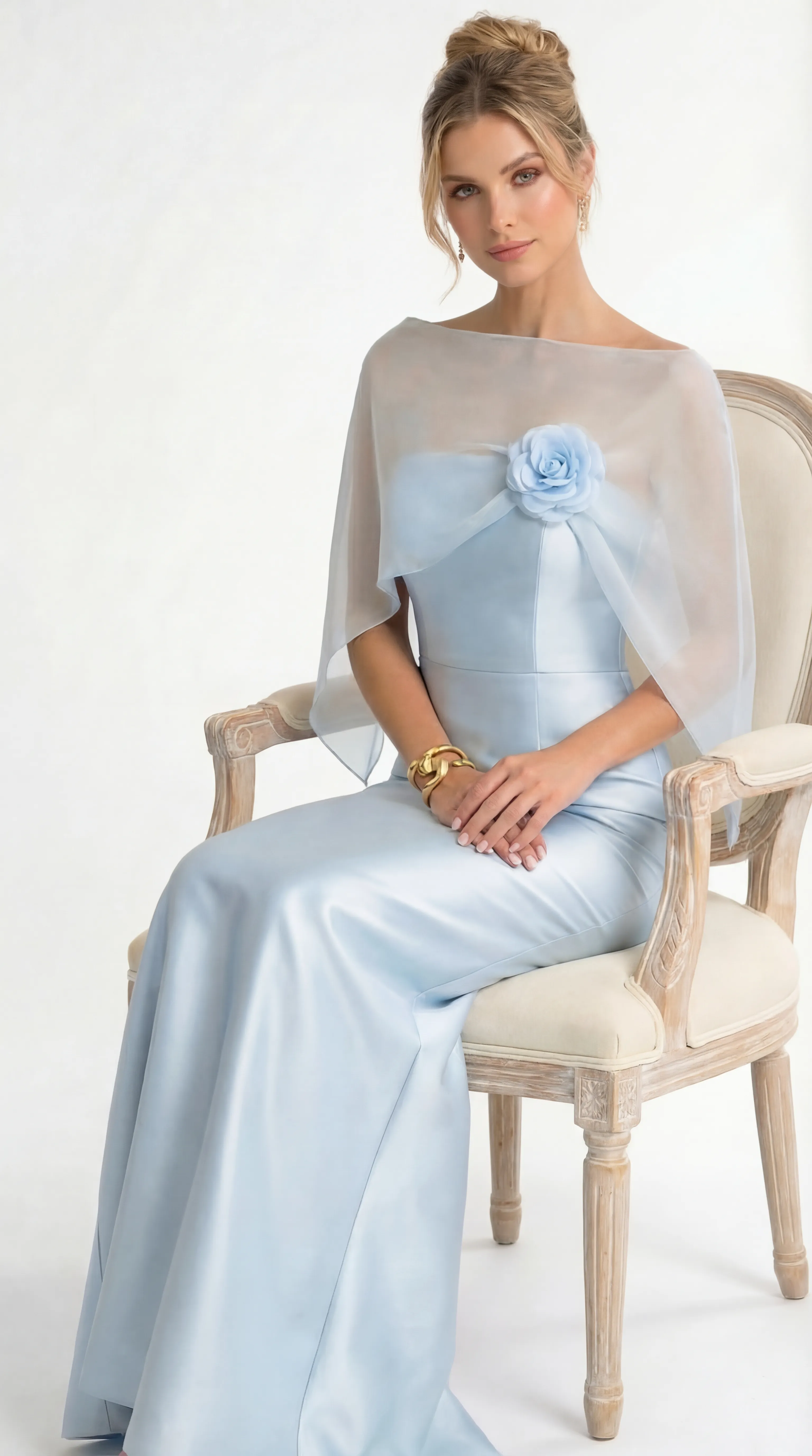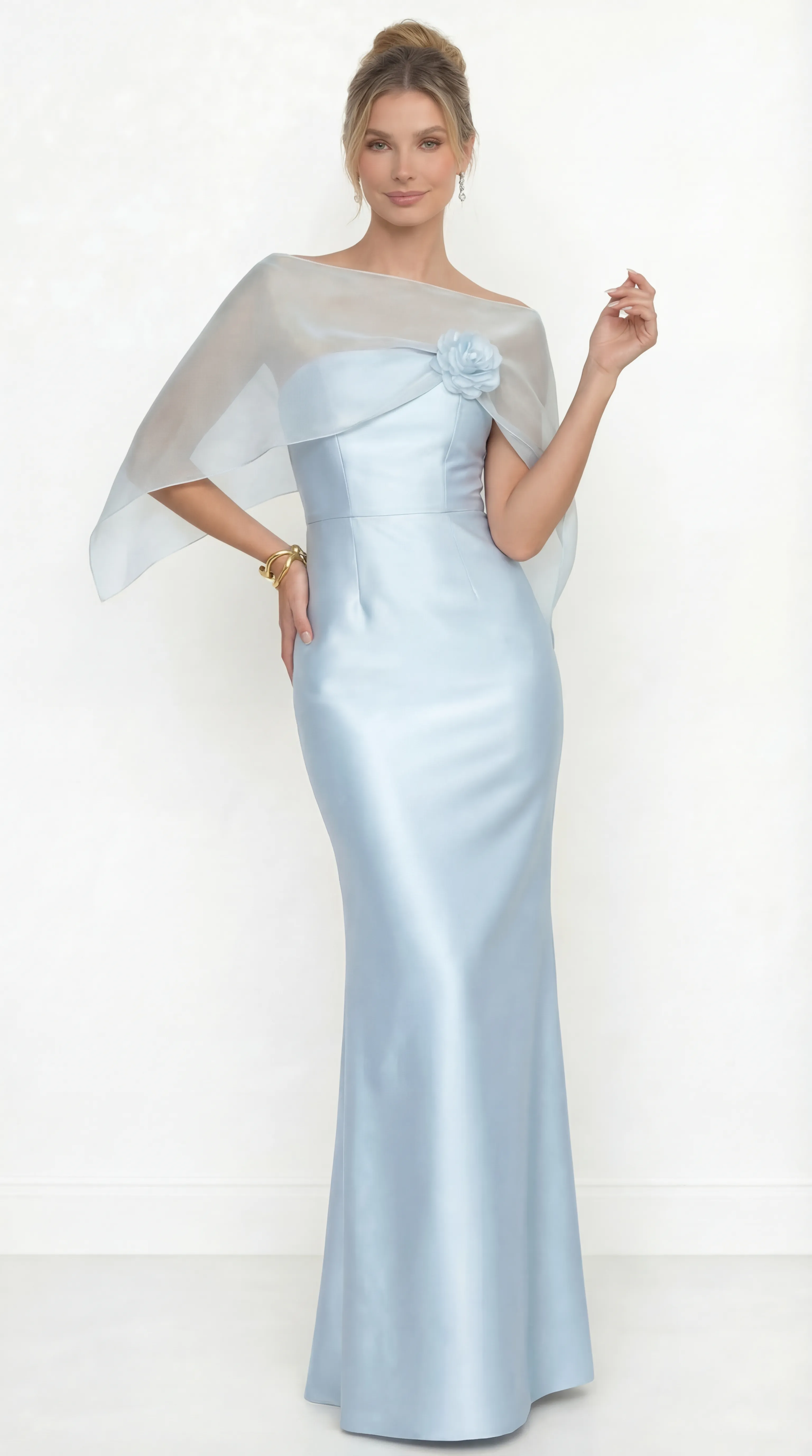 Make an unforgettable entrance in the MUS468, a masterpiece of modern evening wear. Combining the structured glow of silk chun with a delicate silk tơ shoulder wrap and a bespoke fabric flower detail, this icy blue gown offers a perfect blend of high-fashion structure and ethereal romance.