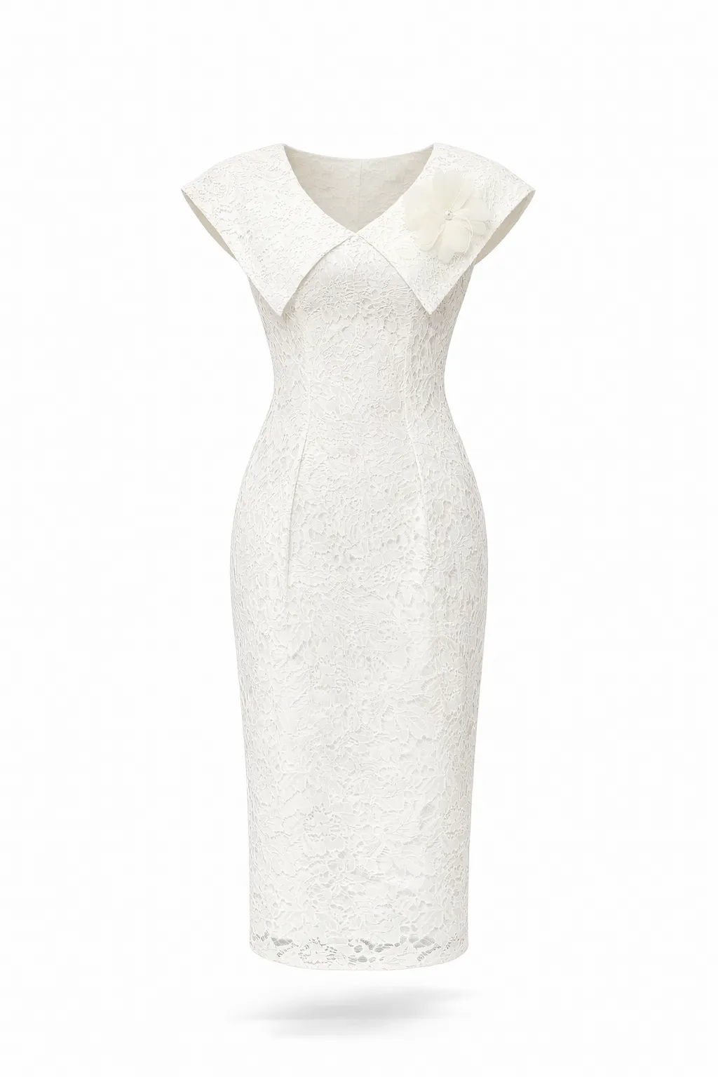 This stunning midi dress in an elegant ivory white is a masterpiece of refined style and feminine grace. The silhouette is tailored in a sophisticated sheath fit that follows the body's lines with poise. A standout feature is the unique off-the-shoulder cape-style sleeves, which are beautifully adorned with a stylized floral accent. This handcrafted flower is designed to be detachable, offering versatility for different looks and occasions.