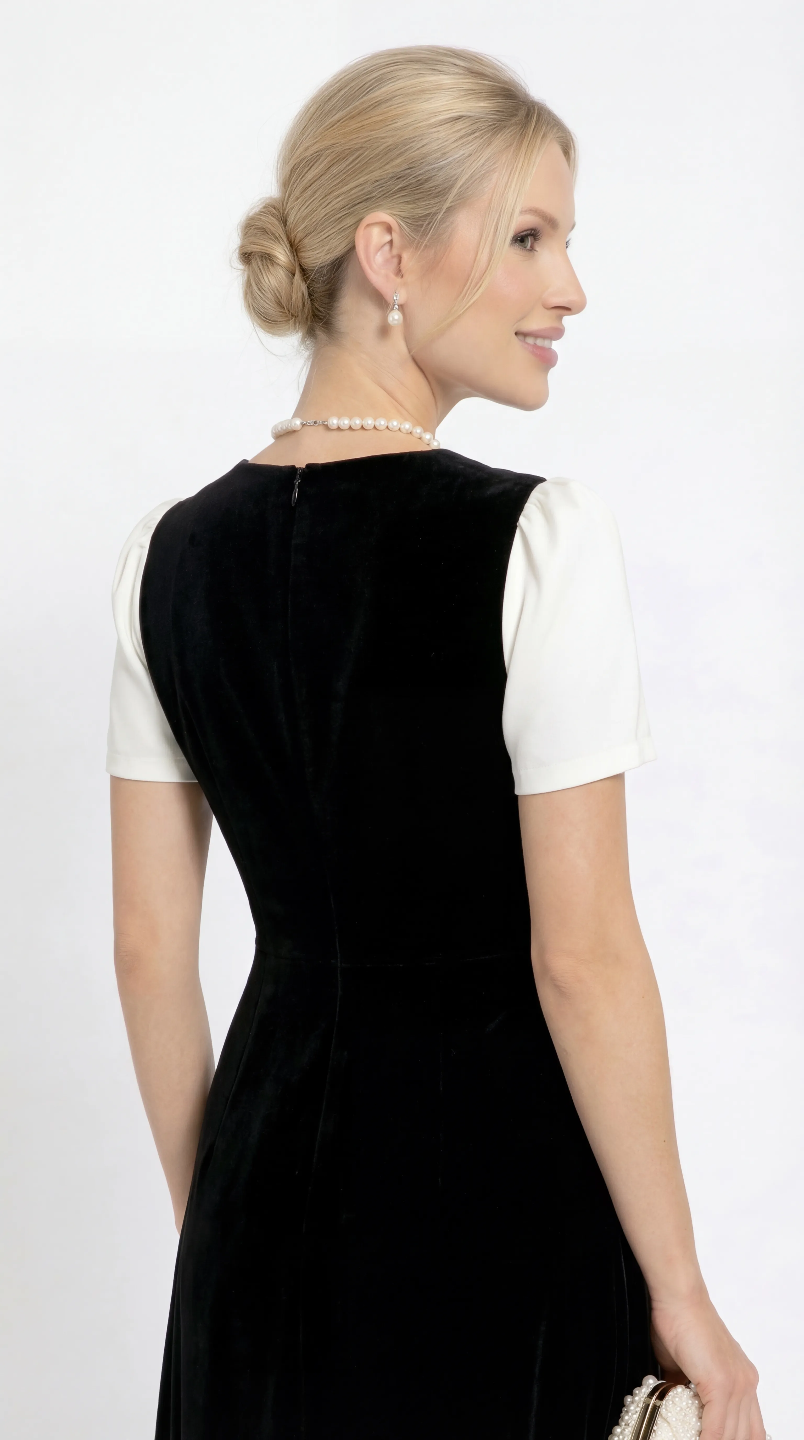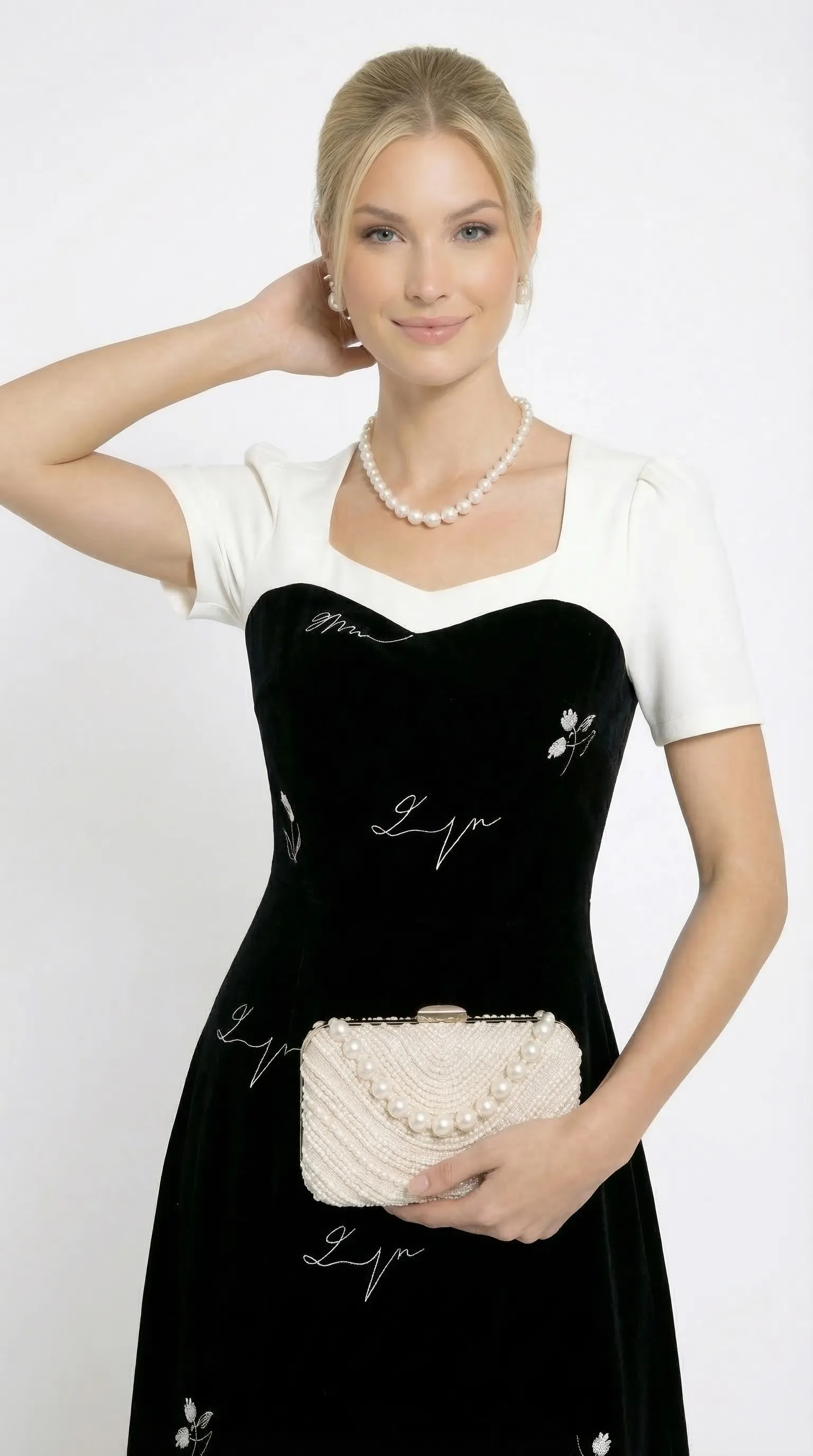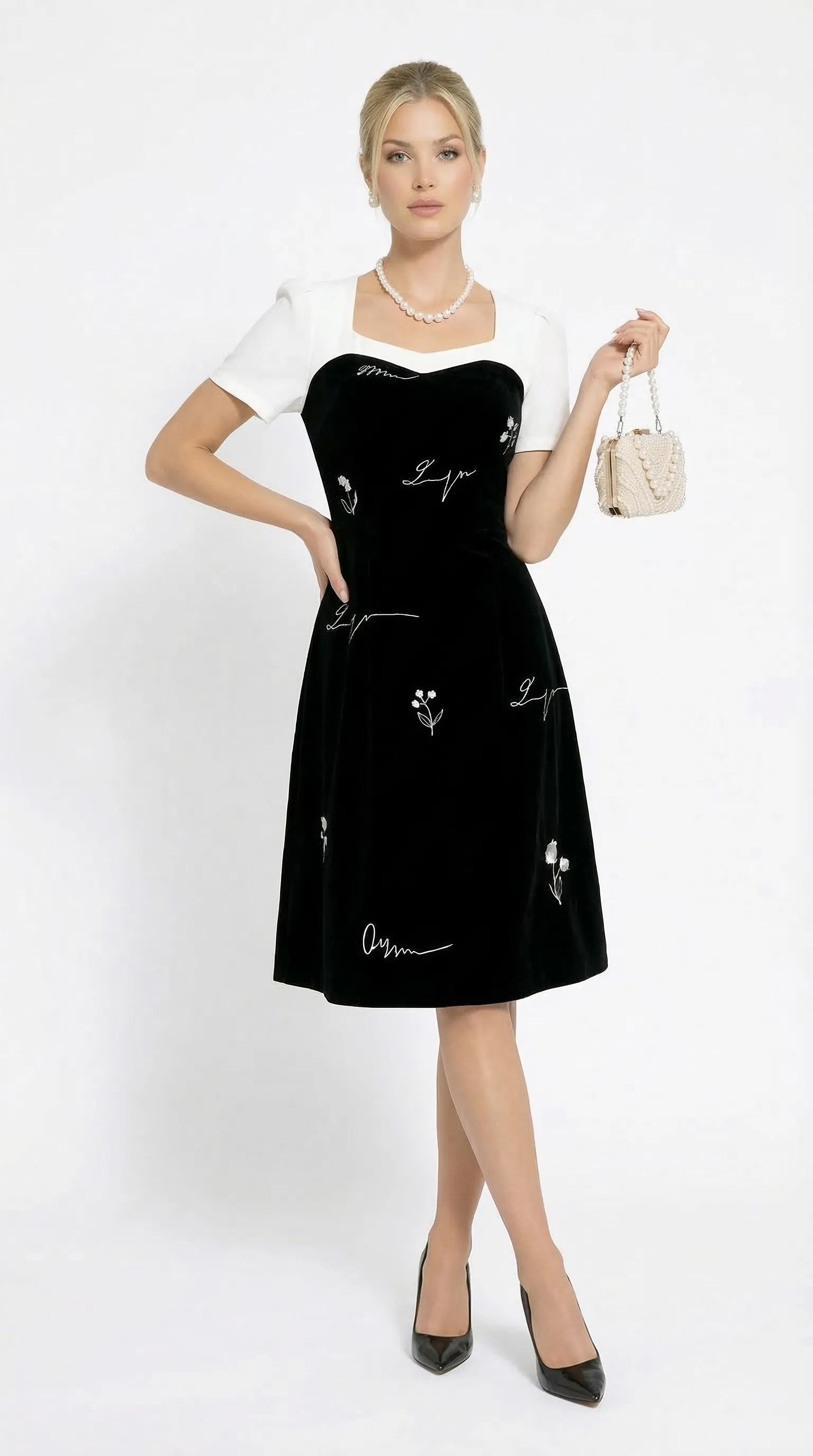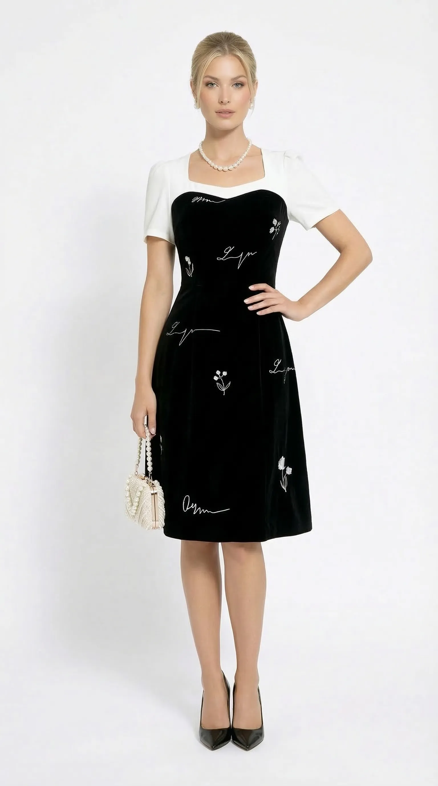 The MDU4379 is an elegant statement in monochrome, blending the rich texture of black velvet with sophisticated white accents. With its handcrafted embroidery and smooth, skin-safe lining, this fit-and-flare midi offers a luxurious and polished silhouette for any high-end occasion.