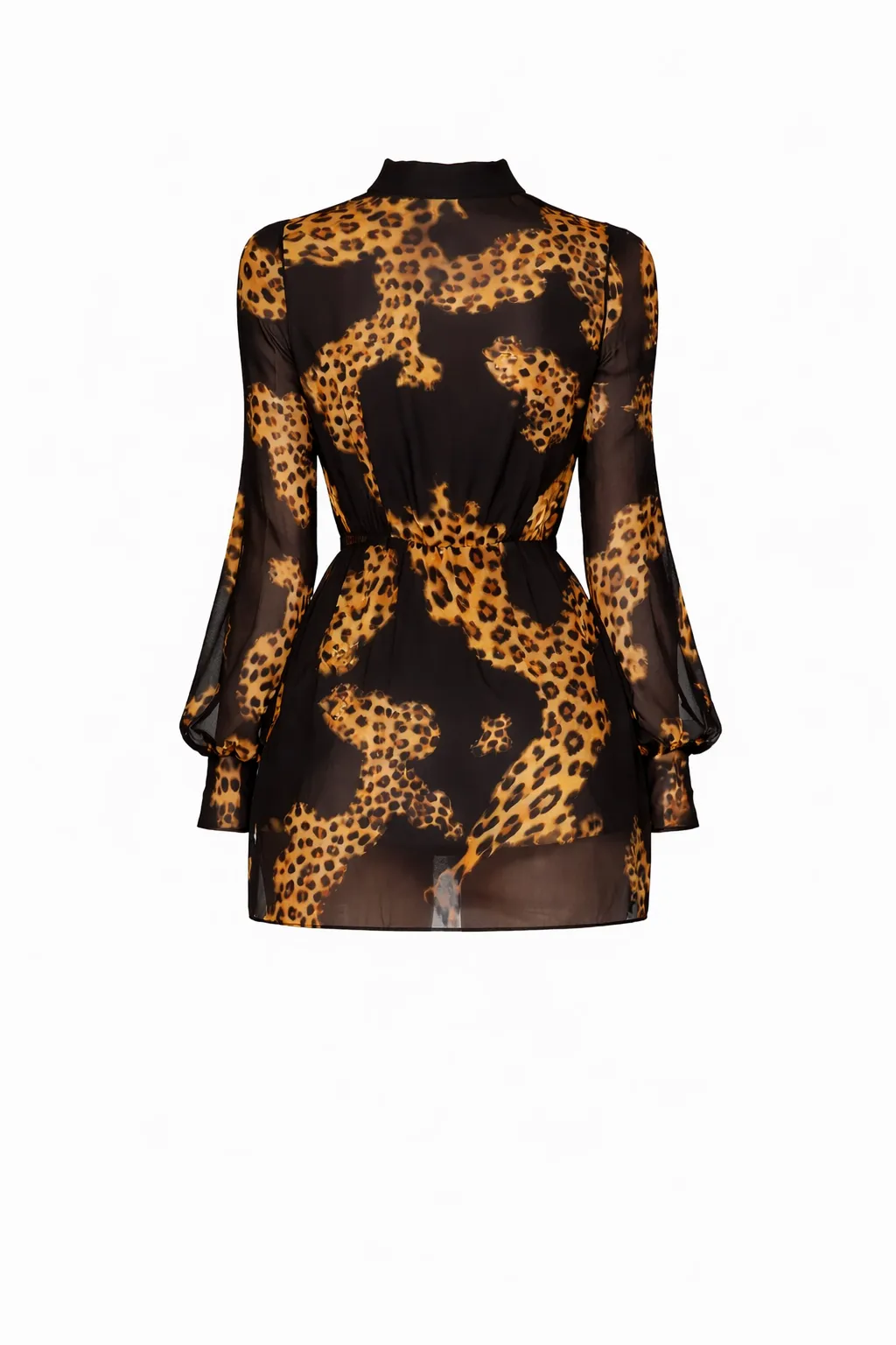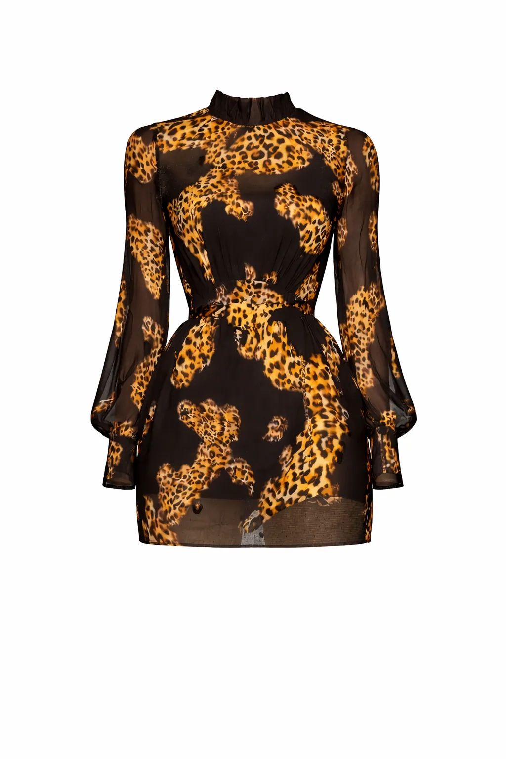 This dress is a masterclass in modern layering, combining fierce animal motifs with a classic, high-fashion silhouette. The design is meticulously engineered to balance bold graphics with romantic, feminine details: