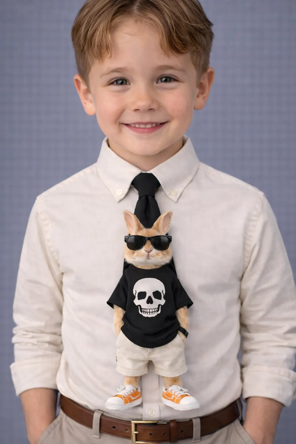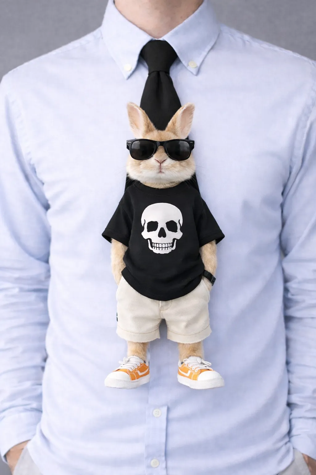 Bold Color Contrast: The black t-shirt and tie base provide a sharp contrast against the bunny’s tan fur and the pop of orange from the sneakers.
