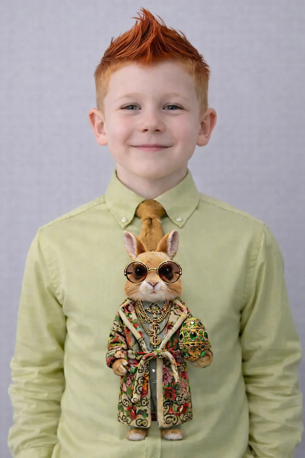 Luxury Accessories: The character is further elevated with designer-inspired round sunglasses and holds an exquisitely detailed, jewel-encrusted Faberge-style Easter egg.