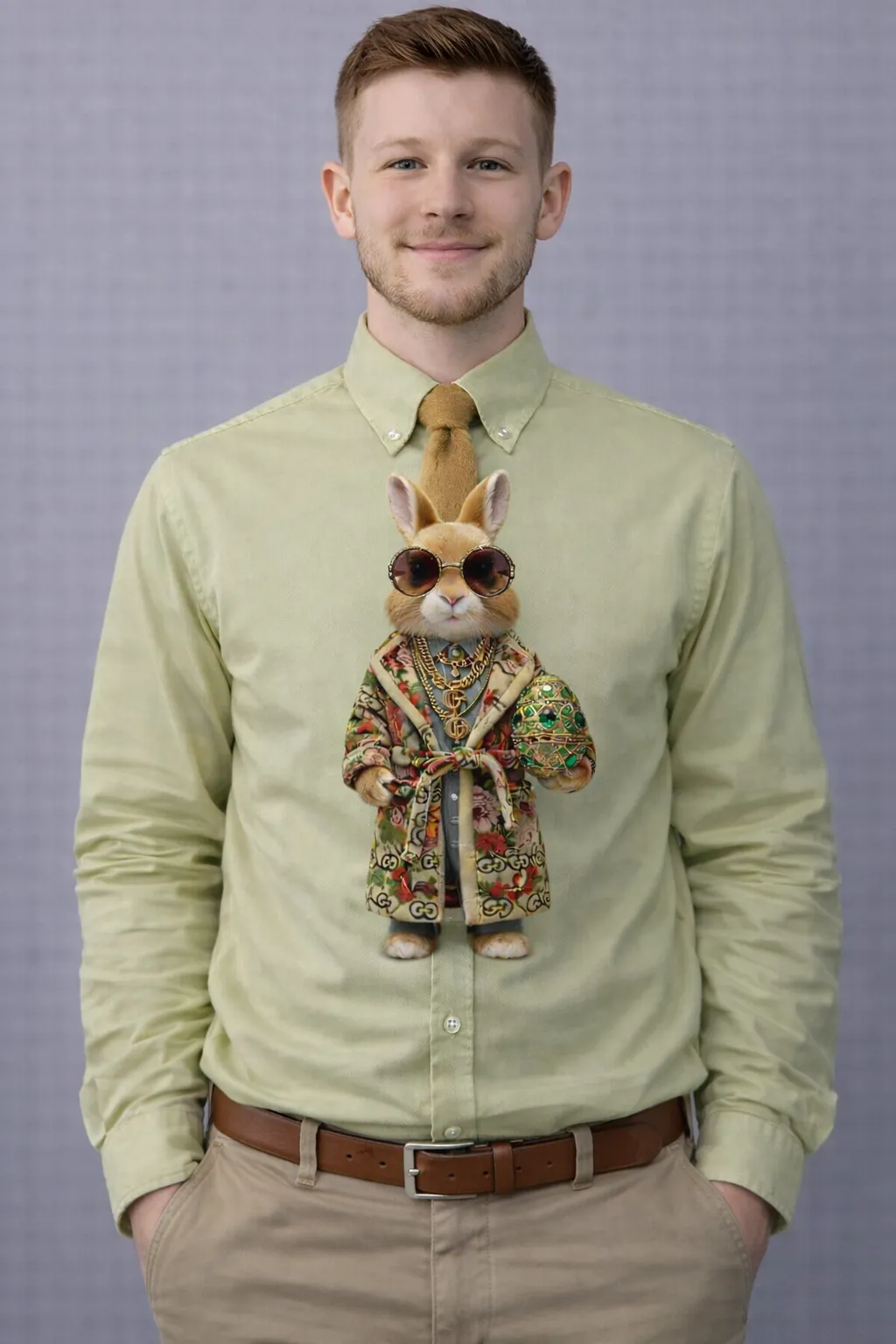 Elevate his festive wardrobe with the MUS487, a luxury novelty tie featuring a high-fashion “Royal” bunny character. Crafted from heavy silk with double-sided reinforcement, this piece showcases a realistic rabbit in ornate floral attire, complete with gold chains and a jeweled egg for a truly unforgettable holiday look.