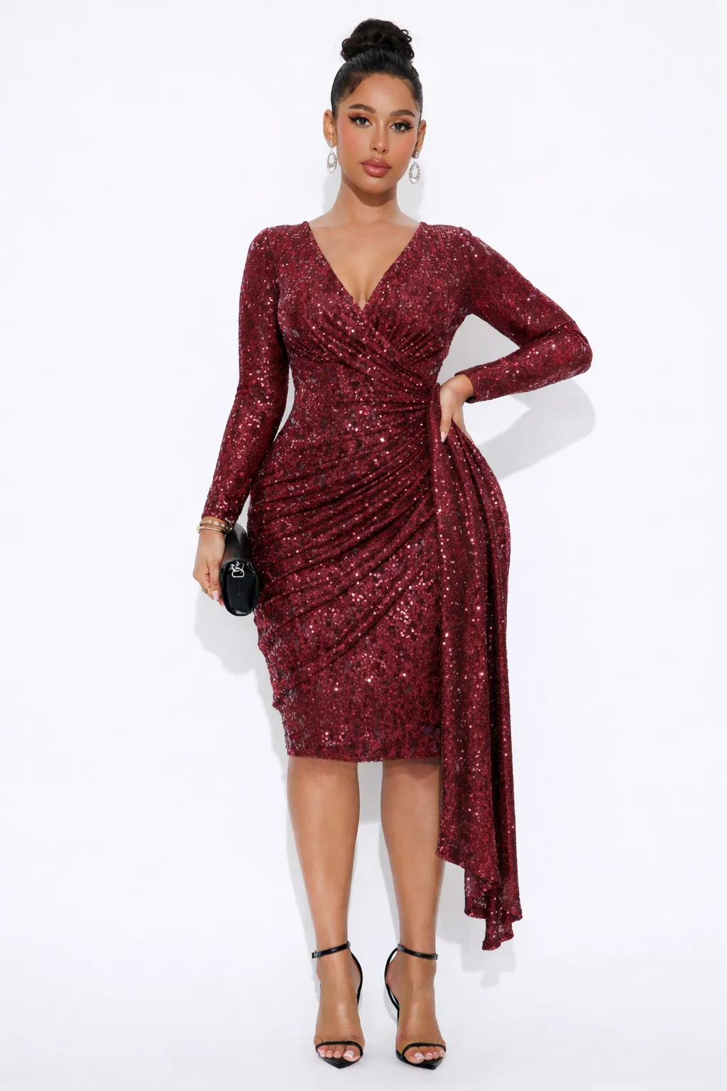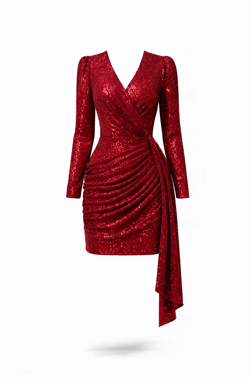 The MDU2252 is a luxurious red party dress defined by its shimmering sequin craftsmanship and elegant wrap silhouette. With its sophisticated side-ruched detailing and long sleeves, it offers a bold yet polished look for making a grand entrance.