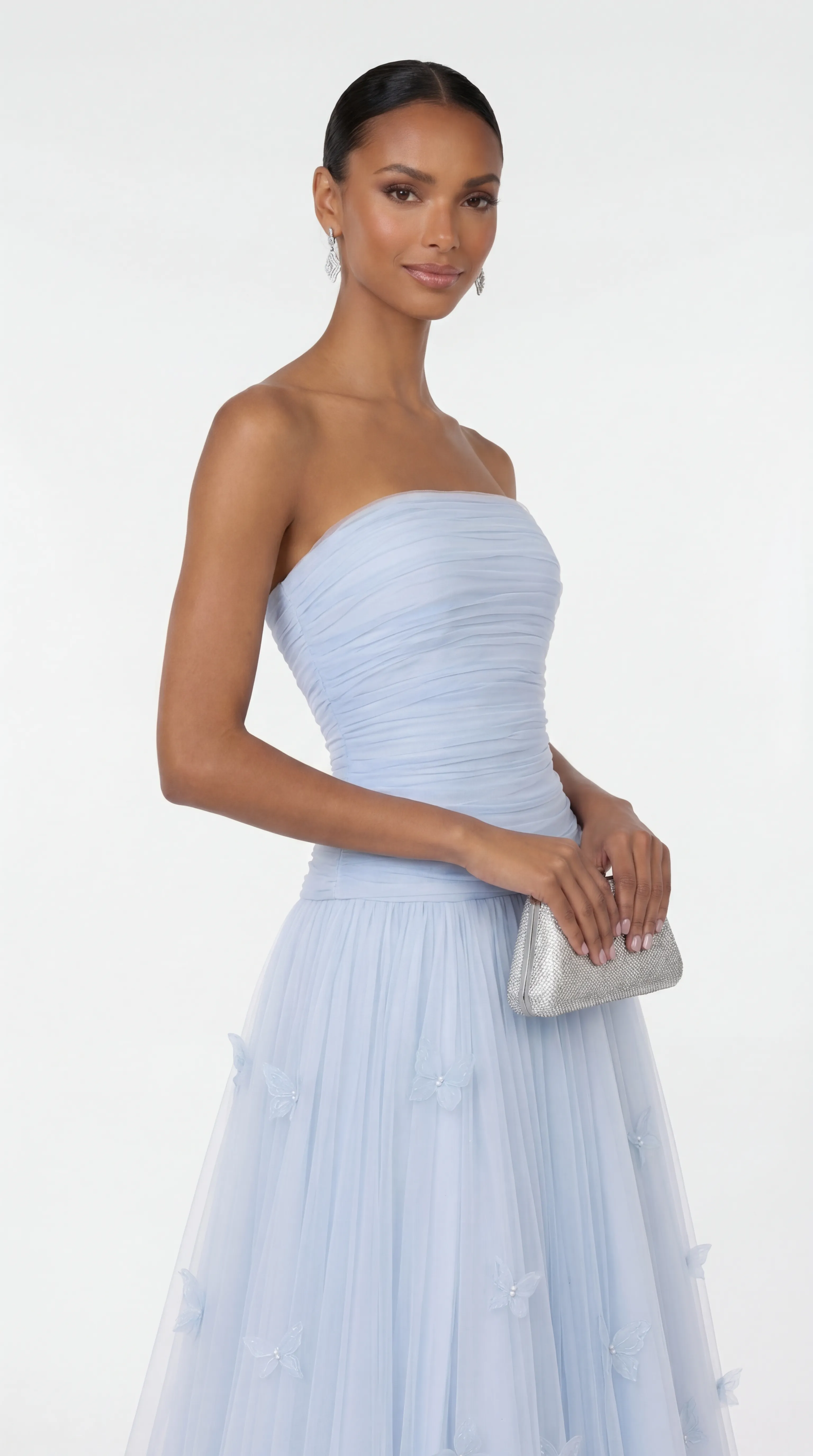 3D Butterfly Appliqués: The sheer outer layer of the skirt is embellished with delicate 3D butterfly motifs, each featuring a shimmering pearl or crystal center for a touch of whimsical luxury.