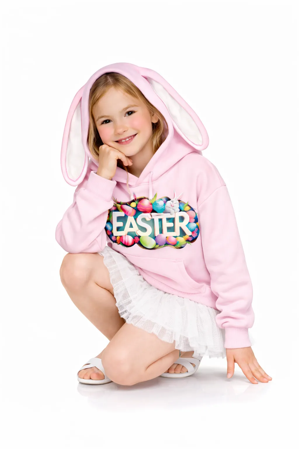 The MUS414 is a vision of playful elegance, pairing a cozy bear-ear hoodie with a delicate tulle skirt. Adorned with a vibrant Easter-themed PET print, this coordinated set offers an effortlessly chic and comfortable silhouette for your most festive spring moments.